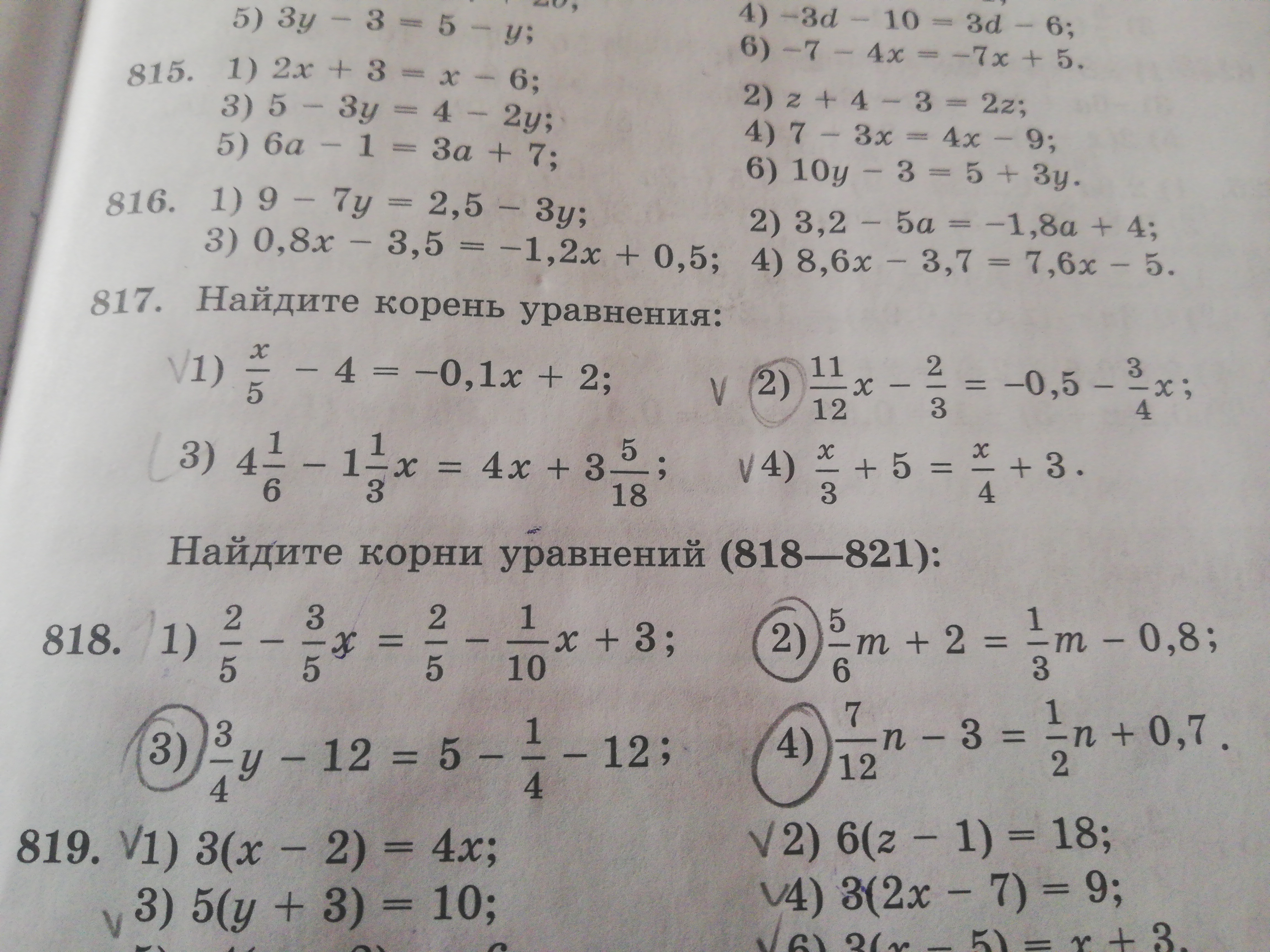 2) frac{5}{6} m + 2 =  frac{1}{3} m - 0.8 \  frac{5}{6} m + 2 =  frac{1}{3} m -  frac{9}{5}   | times 30 \ 25m + 60 = 10m - 54 \ 25m - 10m =  - 54 - 60 \ 15m =  - 114 \ m -  frac{38}{5}  =  - 7 frac{3}{2}  \ 3) frac{3}{4} y - 12 = 5 -  frac{1}{4}  - 12 \  frac{3}{4} y = 5 -  frac{1}{4}  \  frac{3}{4} y =  frac{19}{4}  \ y =  frac{19}{3}  = 6 frac{1}{3}  \ 3) frac{7}{12} n - 3 =  frac{1}{2} n + 0.7 \  frac{7}{12} n - 3 =  frac{1}{2} n +  frac{7}{10}  | times 60 \ 35x - 180 = 30x + 42 \ 35 x - 30x = 42 + 180 \ 5x = 222 \ x =  frac{222}{5}  = 44 frac{2}{5}