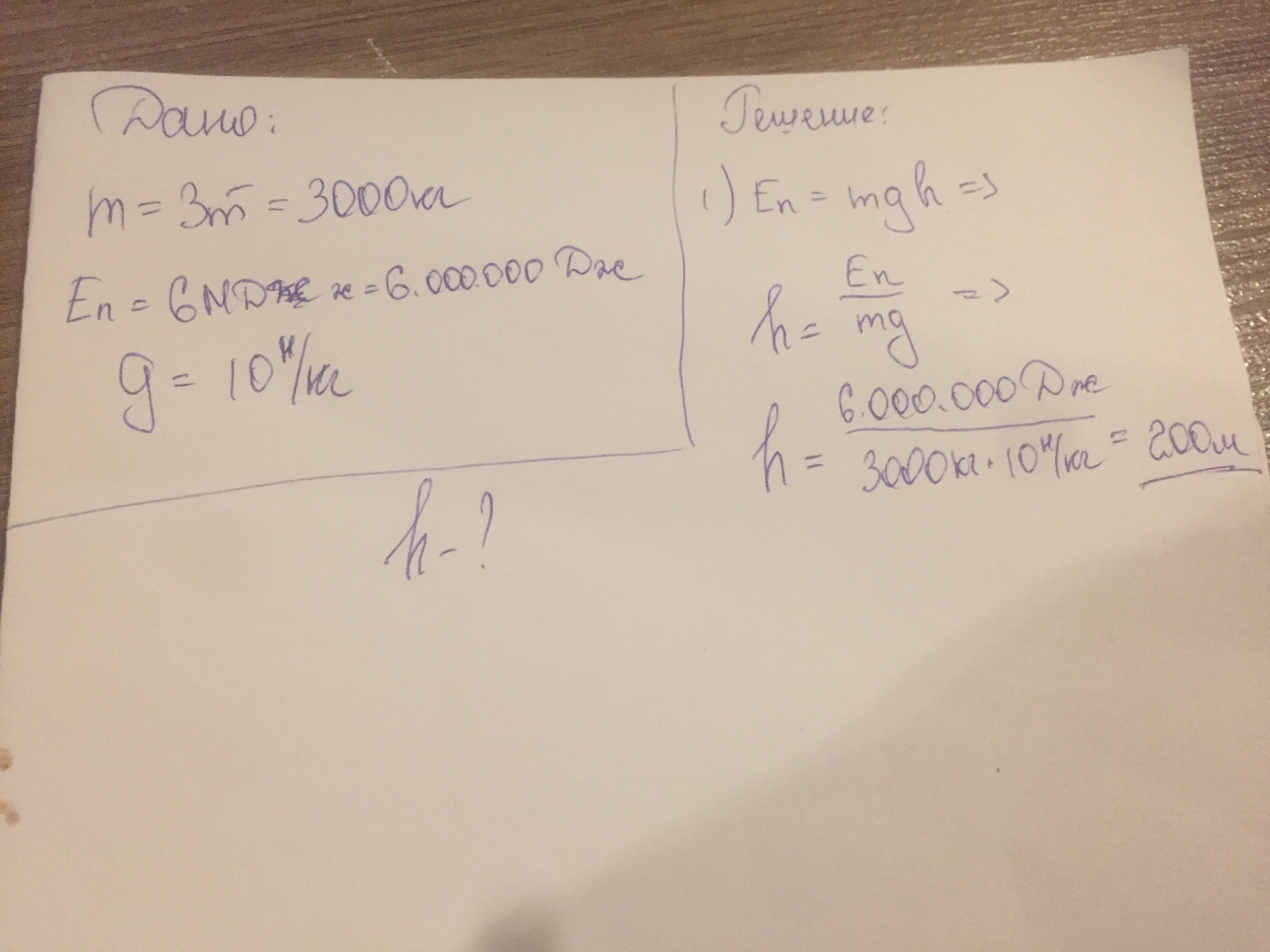 h=Еп:gm=6 000 000 / 30 000 = 200м