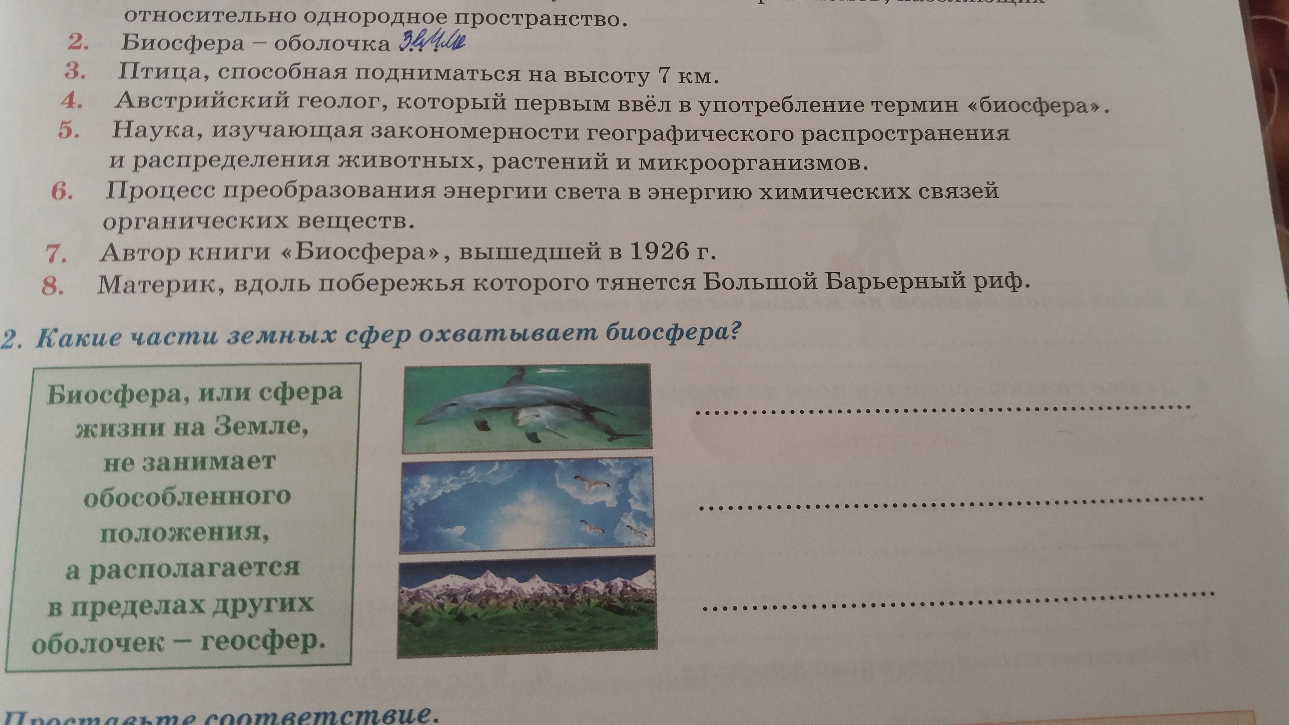 Биосфера — оболочка Земли, заселённая живыми организмами и преобразованная ими. Биосфера начала формироваться не позднее, чем 3,8 млрд лет назад, когда на нашей планете стали зарождаться первые организмы. Она проникает во всю гидросферу, верхнюю часть литосферы и нижнюю часть атмосферы, то есть населяет экосферу. Биосфера представляет собой совокупность всех живых организмов. В ней обитает более 3 000 000 видов растений, животных, грибов и бактерий. Человек тоже является частью биосферы, его деятельность превосходит многие природные процессы и, как сказал В. И. Вернадский: «Человек становится могучей геологической силой».