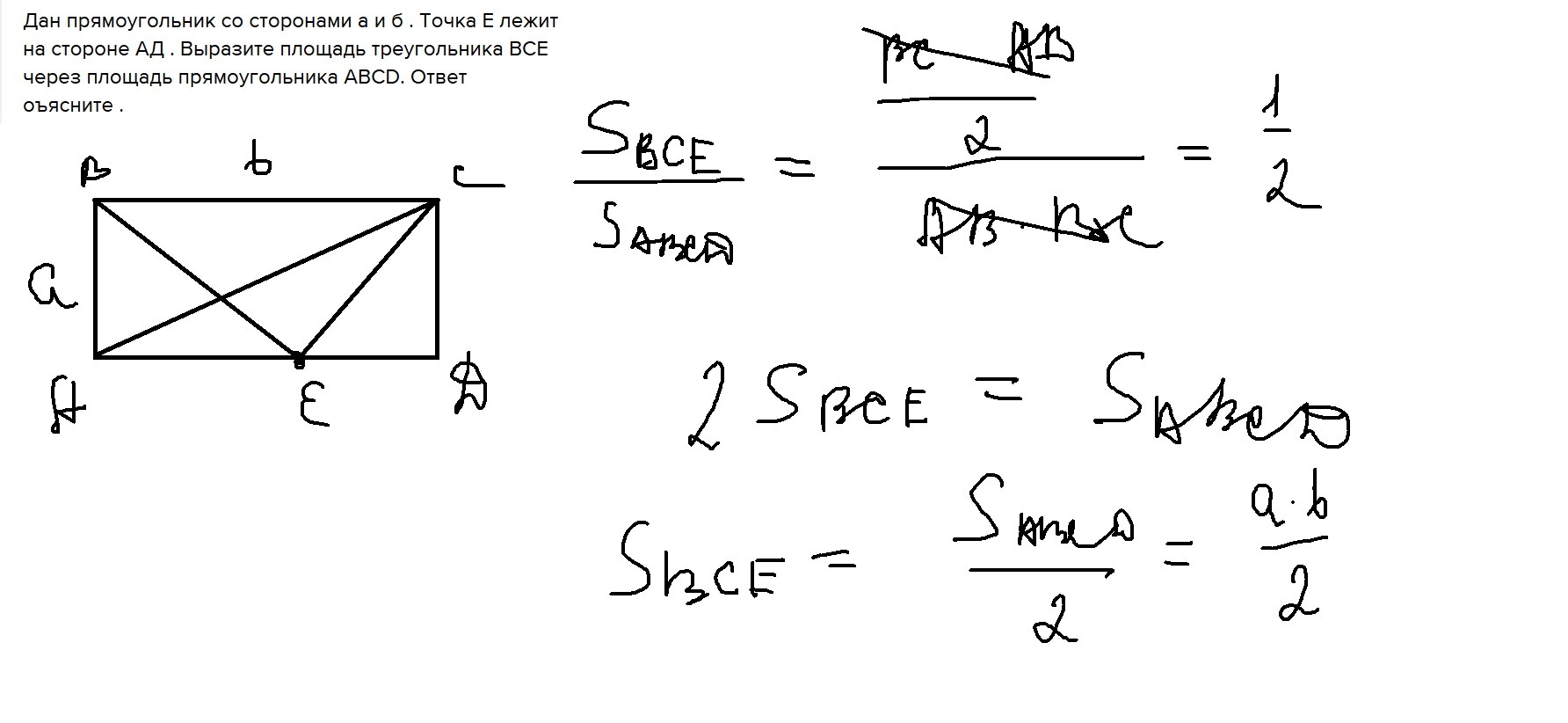 Дан прямоугольник со сторонами а и б . Точка Е лежит на стороне АД . Выразите площадь треугольника BCE через площадь прямоугольника ABCD. Ответ оъясните .