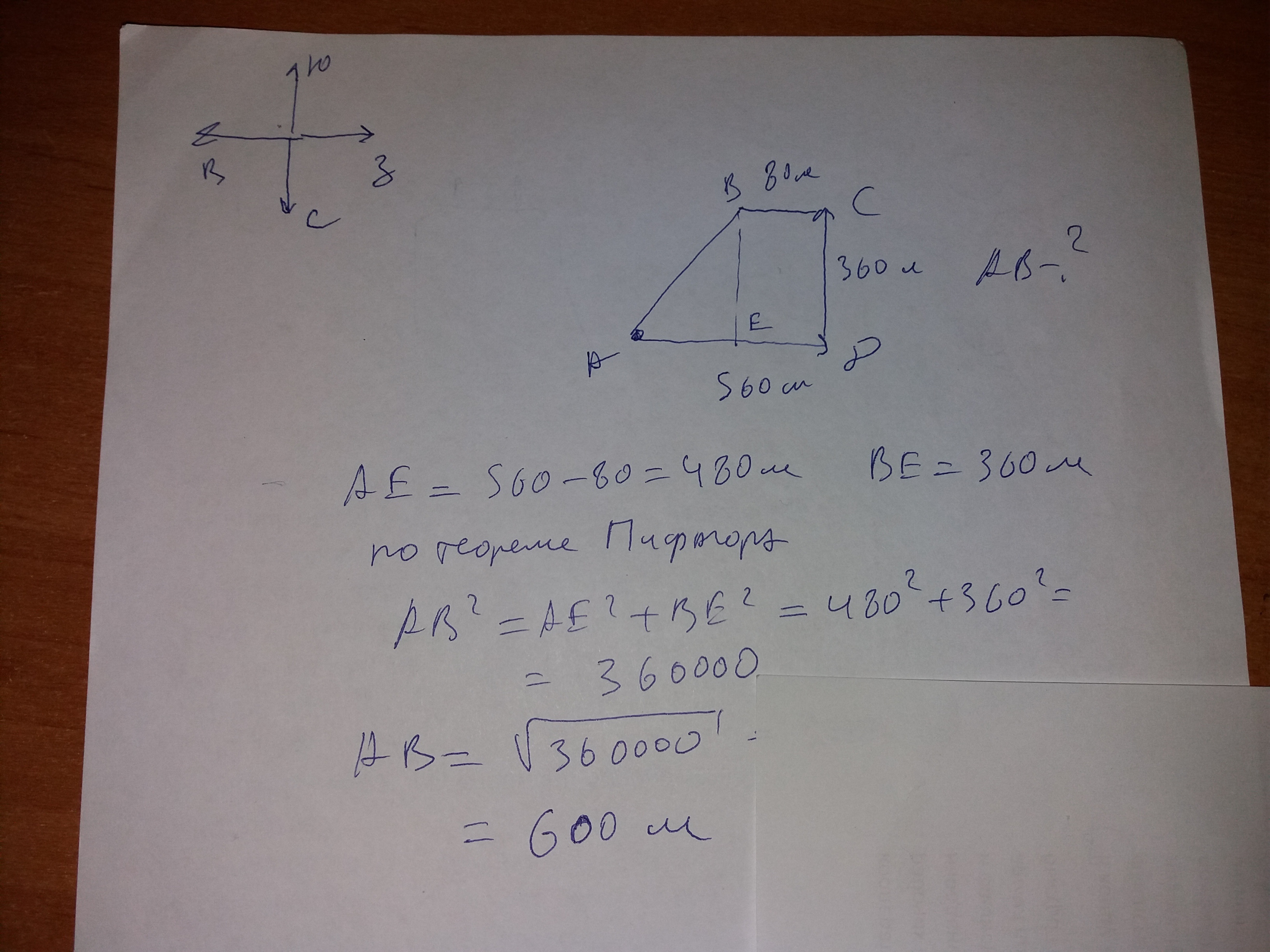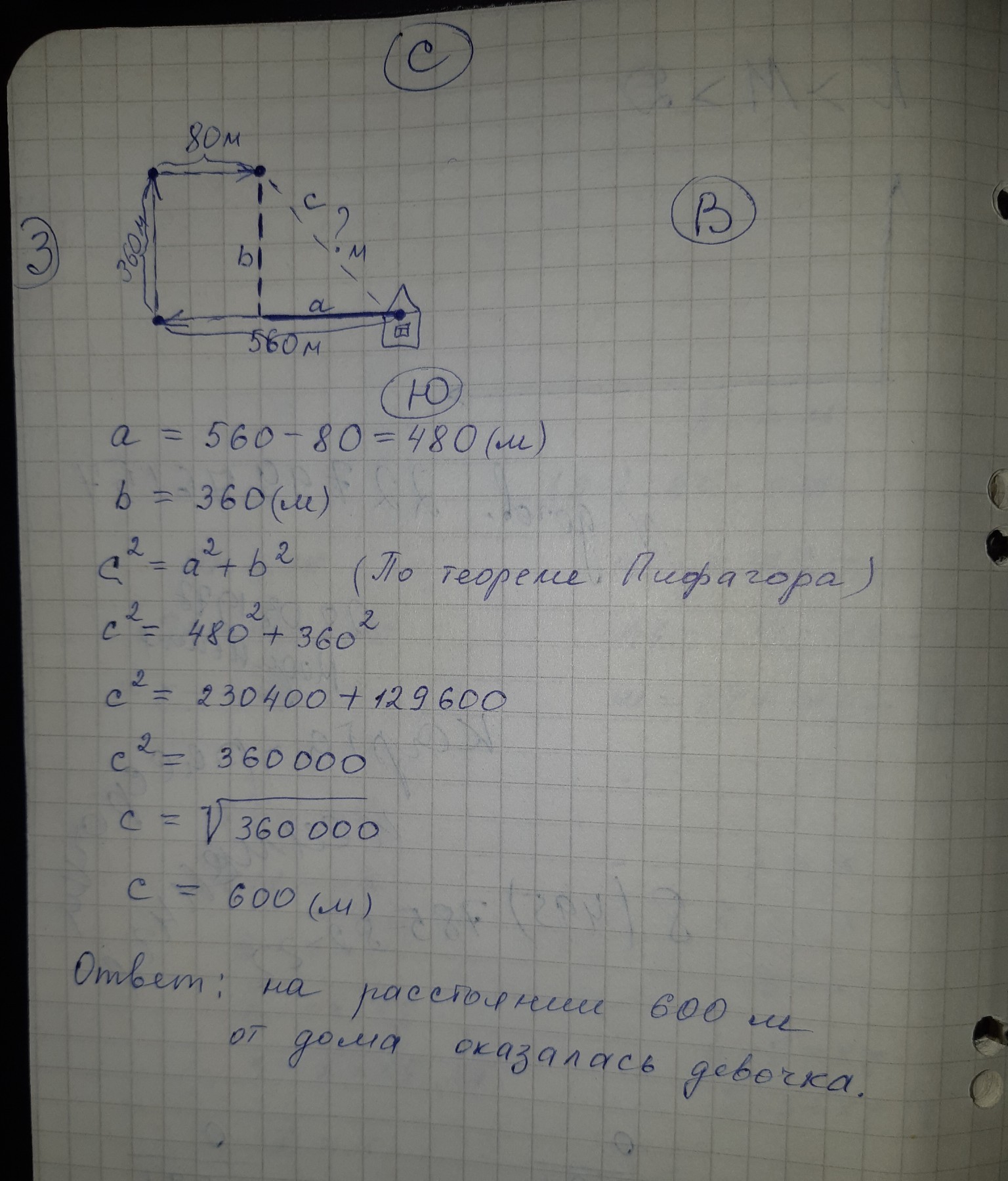 Девочка прошла от дома по направлению на запад 560 м. Затем повернула на север и прошла 360 м. После этого она повернула на восток и прошла ещё 80 м. На каком расстоянии (в метрах) от дома оказалась девочка?