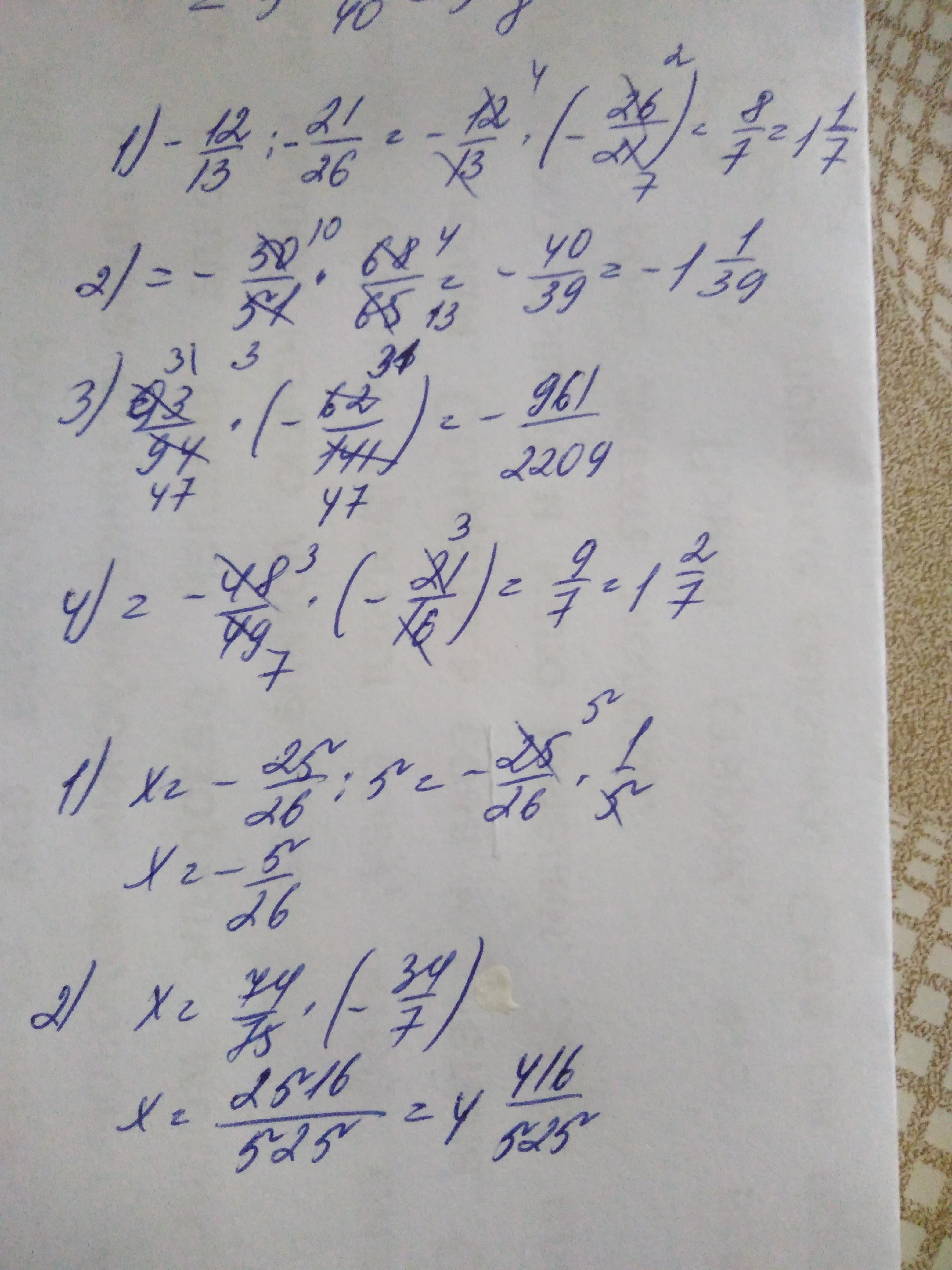 1)-25/26 : х = 5; 2) х : 74/75 = -34/7