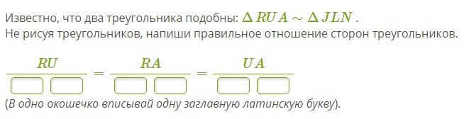 Известно, что два треугольника подобны: ΔRUA∼ΔJLN.