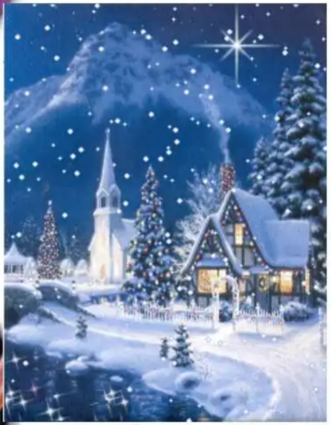 Перед нами чудесный вечерний пейзаж.Глаз не отвести!Большие,красивые дома.От вида этих домов на душе становится уютно и тепло.Покрытые снегом,нарядные ёлки.Небо всё в мерцающих звёздах.Замерзшая река,окаймлённая сугробами.Над рекой каменный мостик.Завораживающая картина!Всё как в волшебной сказке про зиму!