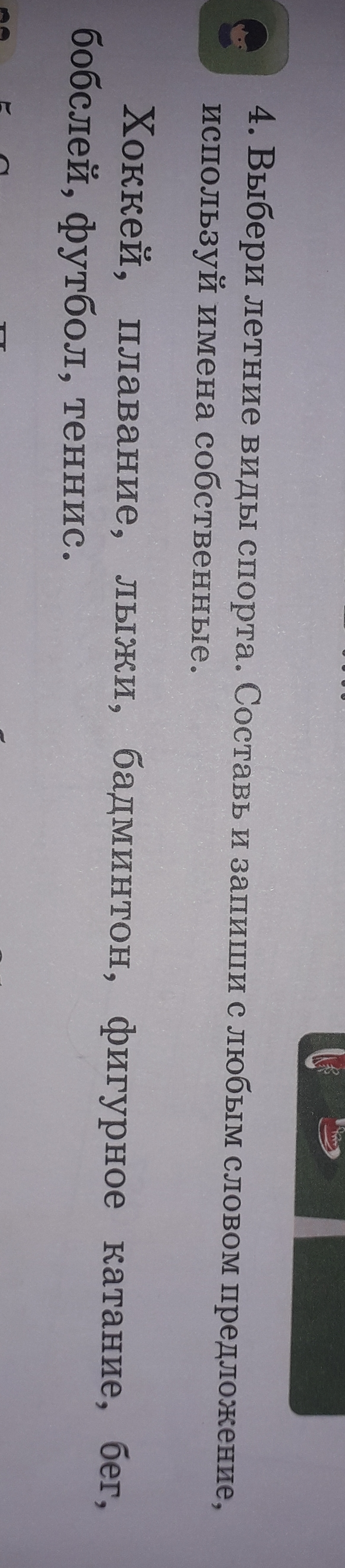 Летние виды спорта: плавание, бадминтон, бег, футбол, теннис.