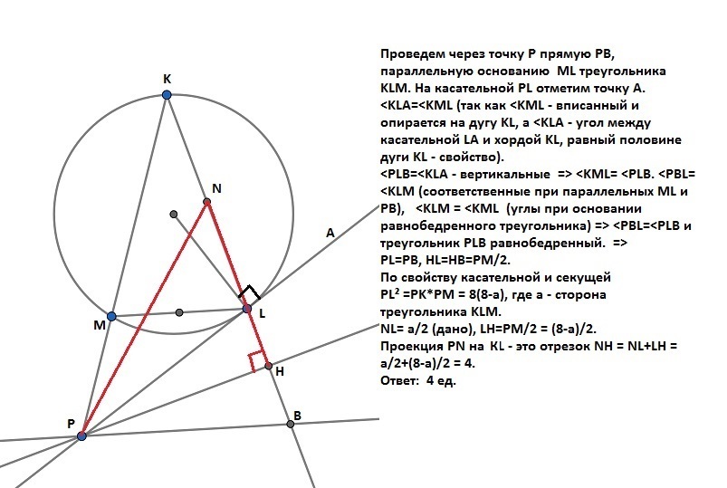 Проведем через точку Р прямую PB, параллельную основанию MLтреугольника KLM. На касательной PL отметим точку А. <KLA=<KML (так как <KML - вписанный и опирается на дугу KL, а <KLA - угол между касательной LA и хордой KL, равный половине дуги KL - свойство).