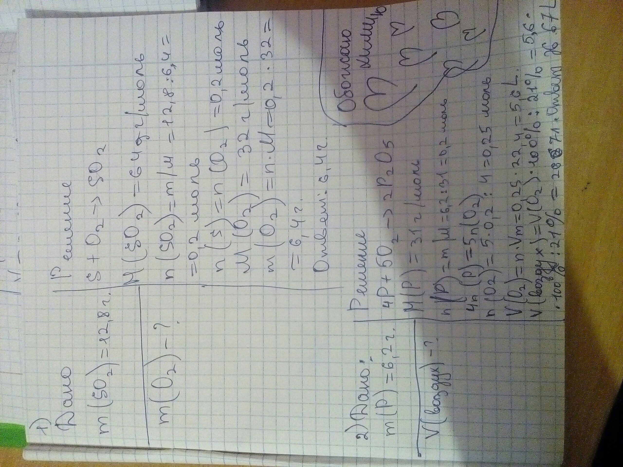 Решите две задачи по химии 8 класс: 1)Какая масса кислорода израсходуется на получение 12,8 г сернистого газа (SO2)? 2) Какой объем воздуха затратится на сжигание 6,2 г фосфора? Валентность фосфора - 5