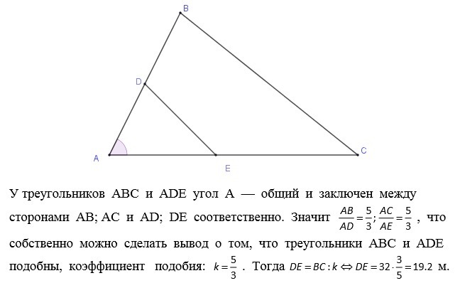Задача: В треугольнике ABC AB= 15 м, AC= 20 м, BC= 32 м. На стороне AB отложен отрезок AD= 9м, а на стороне AC - отрезок AE= 12 м Чему равна длина отрезка DE?