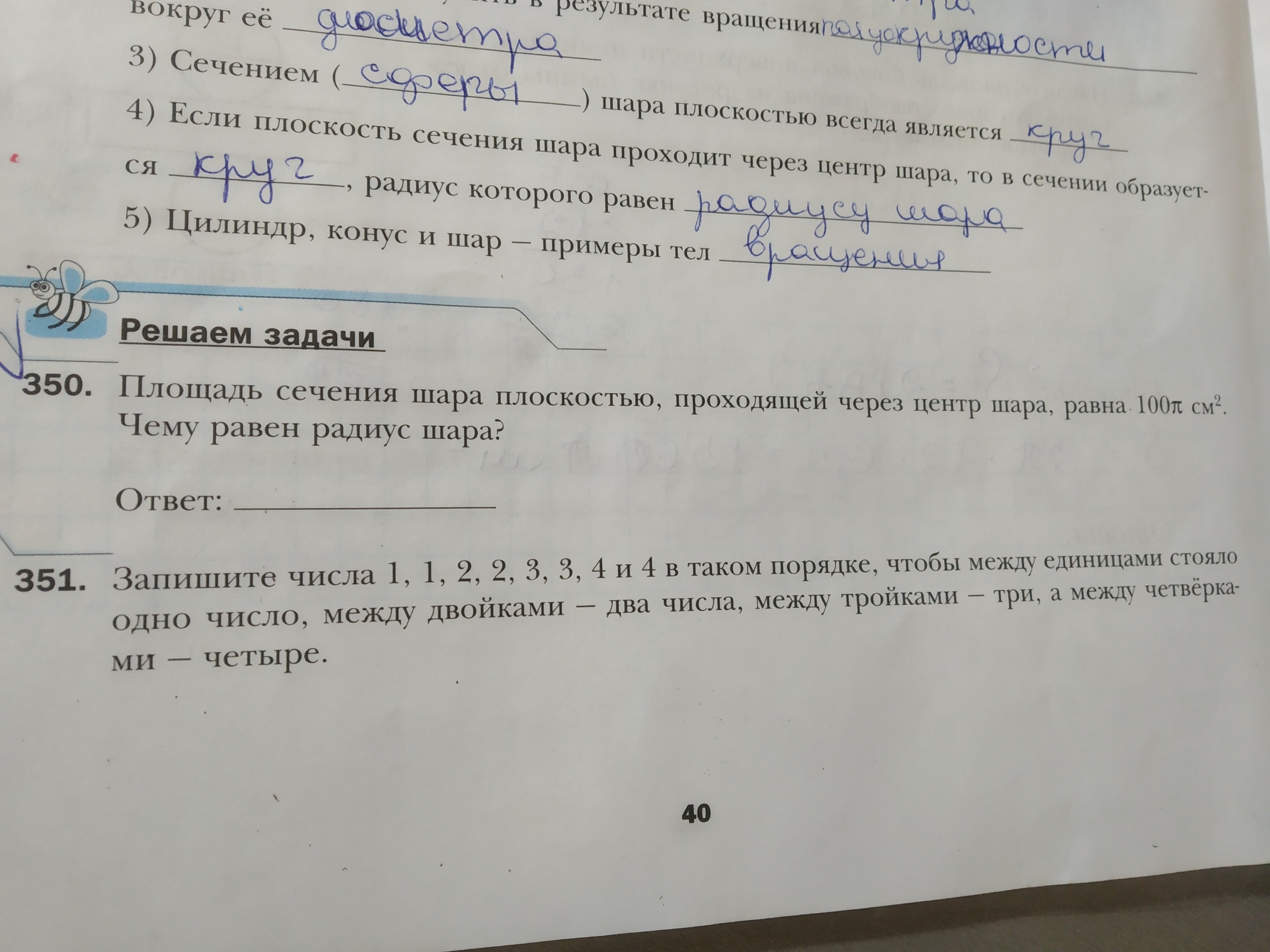 Площадь сечения шара плоскостью, проходящей через центр шара равна 100пи см в КВ. Чему равен радиус шара 6 класс Мерзляк в рабочей тетради номер 350 помогите пж с решением