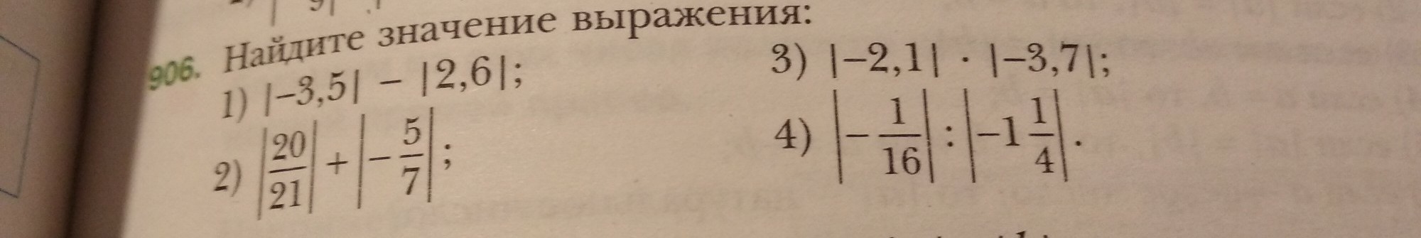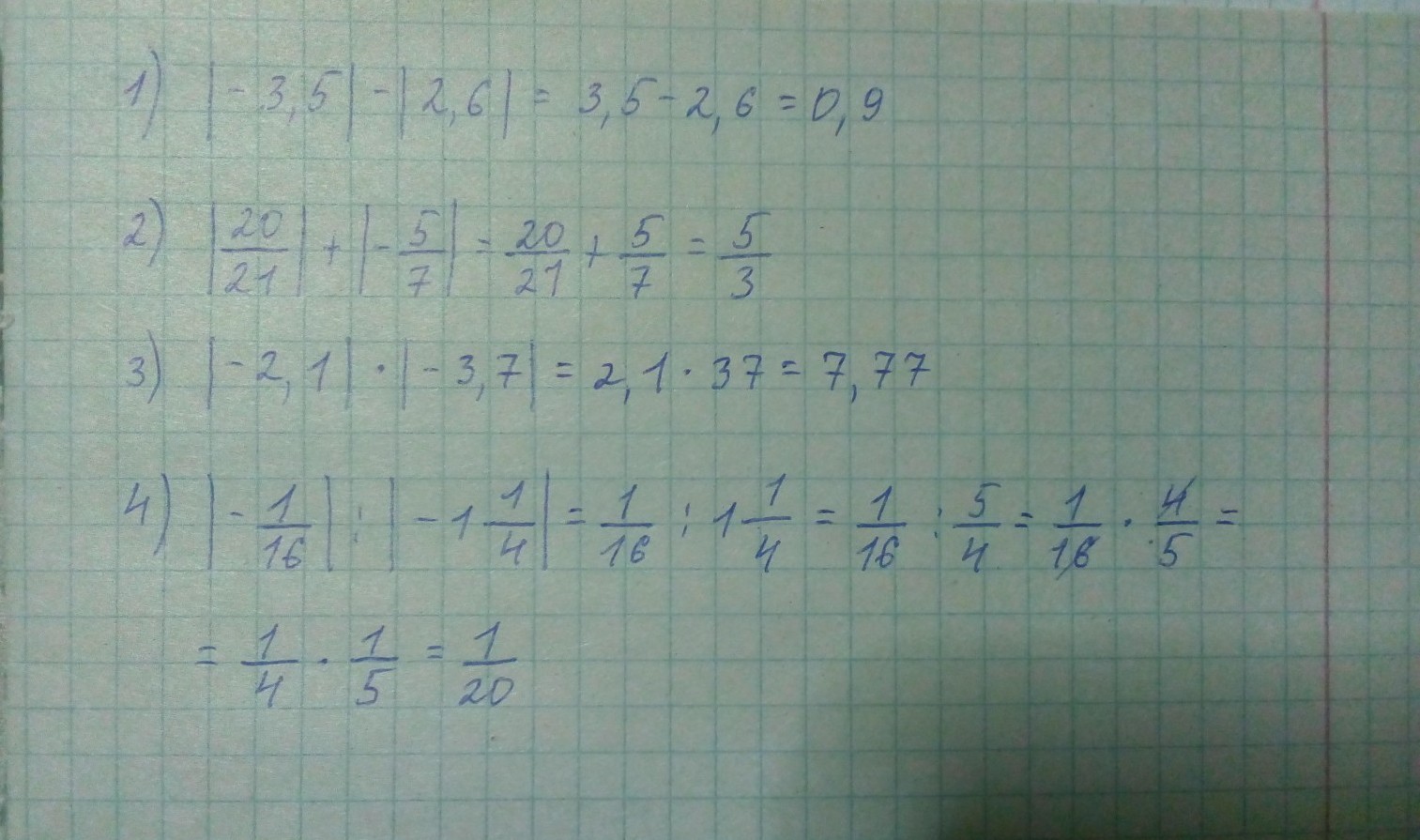 1) |-3.5| - |2.6|=0.9 2)|20/21 |+ |-5/7|= 20 + 15/21=35/21=5/3 3)|-2.1| x |-3.7|=2.1 x 3.7=7.77 4)|-1/16| : |-1x1/4|= 1/16 x 4/5=1/20