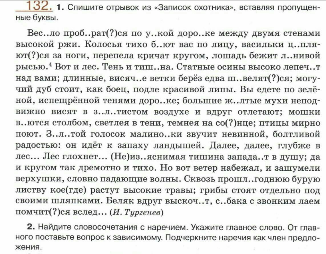 Весело пробраться по узкой дорожке между двумя стенами высокой ржи. Колосья тихо бьют вас по лицу, васильки цепляются за ноги, перепела кричат кругом, лошадь бежит ленивой рысью. Вот и лес. Тень и тишина. Статные осины высоко лепечут над вами; длинные, висячие ветки берез едва шевелятся; могучий дуб стоит, как боец, подле красивой липы. Вы едите по зеленой, испещренной тенями дорожке; большие желтые мухи неподвижно висят в золотистом воздухе и вдруг отлетают; мошки вьются столбом, светлея в тени, темнея на солнце; птицы мирно поют. Золотой голосок малиновки звучит невинной, болтливой радостью: он идет к запаху ландышей. Далее, далее, глубже в лес... Лес глохнет... Неизъяснимая тишина западает в душу; да и кругом так дремотно и тихо. Но вот ветер набежал, и зашумели верхушки, словно падающие волны. Сквозь прошлогоднюю бурую листву кое где растут высокие травы; грибы стоят отдельно под своими шляпками. Беляк вдруг выскочит, собака с звонким лаем помчится вслед. ( И. Тургенев)
