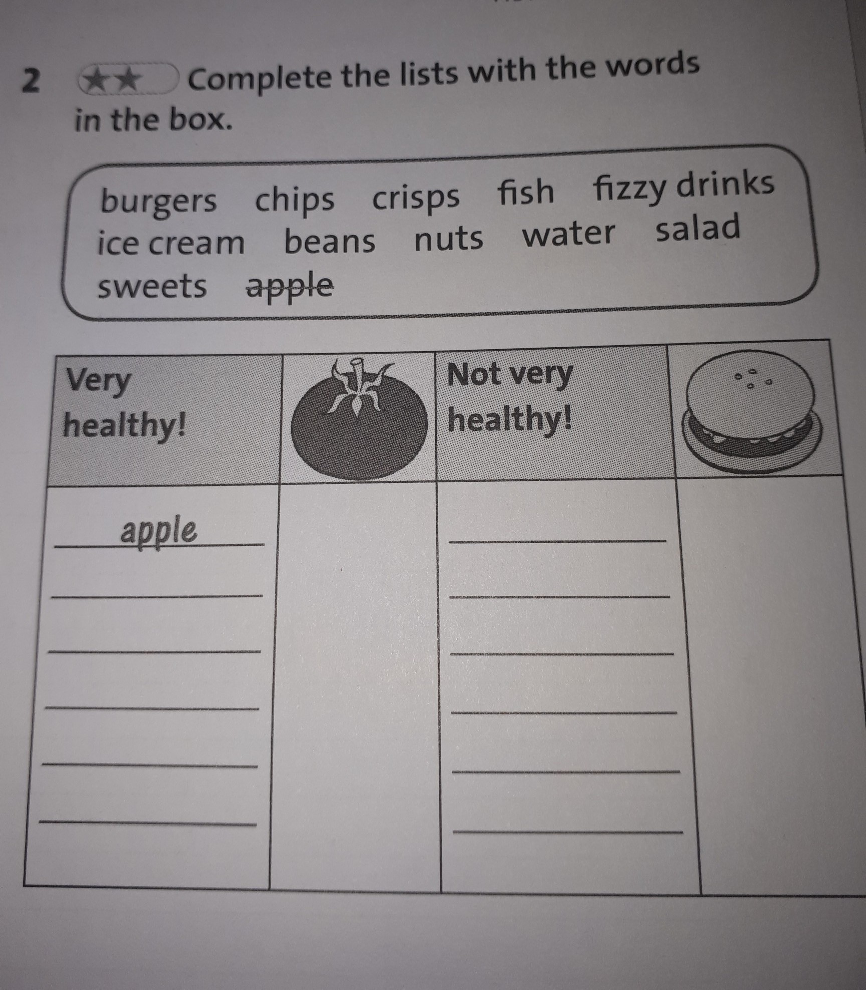 very healthy: apple, fish, beans, nuts, water, salad