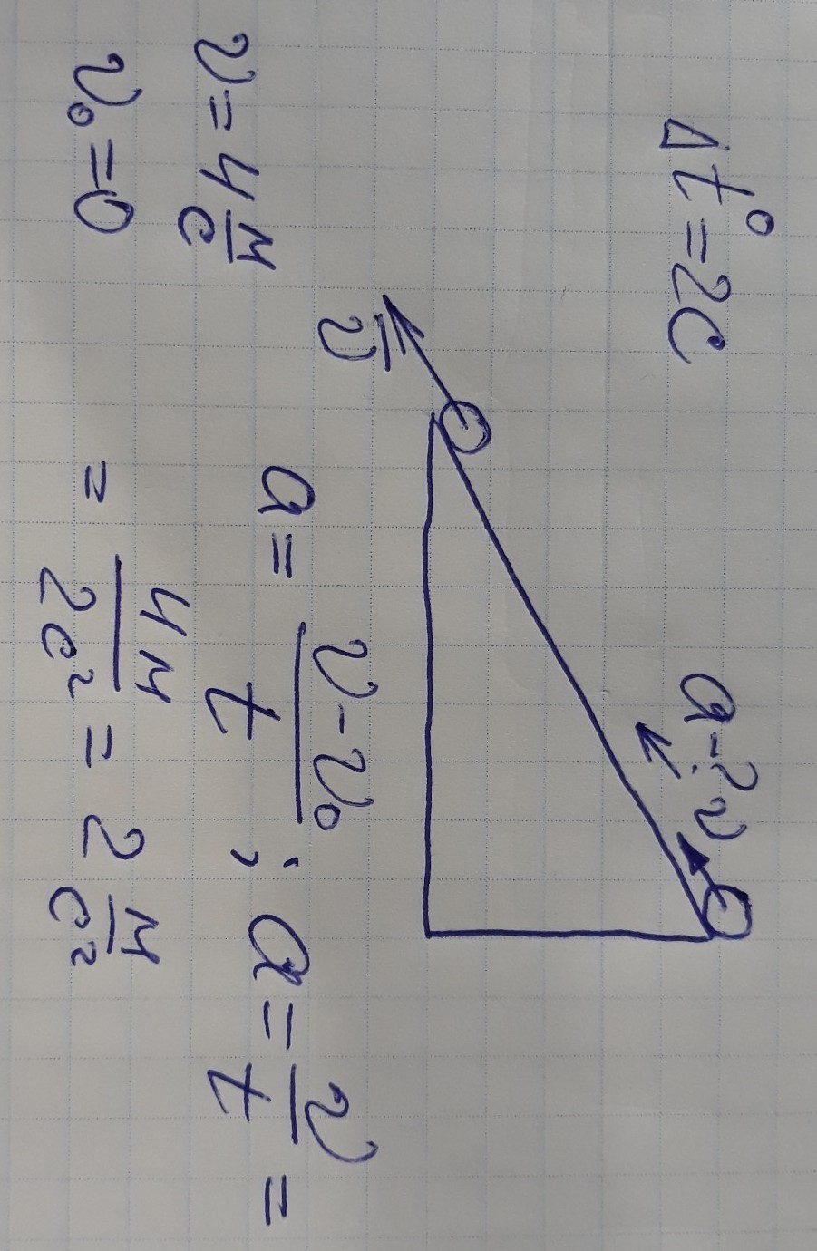 шарик скатывается с наклонной плоскости, через промежуток времени ∆t= 2с после начала движения приобретает скорость , модуль которой v= 4м/с . определите модуль ускорение шарика