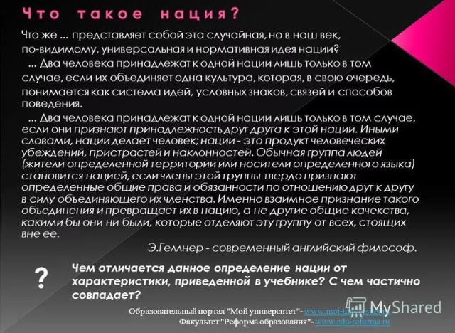 нам известно по определению, что нация является общностью людей, возникшей на базе общности языка, культуры, территории. Однако Геллнер считает, что необязательно жить на одной территории надо, чтобы у людей было взаимное признание объединения, тогда данную общность можно называть нацией