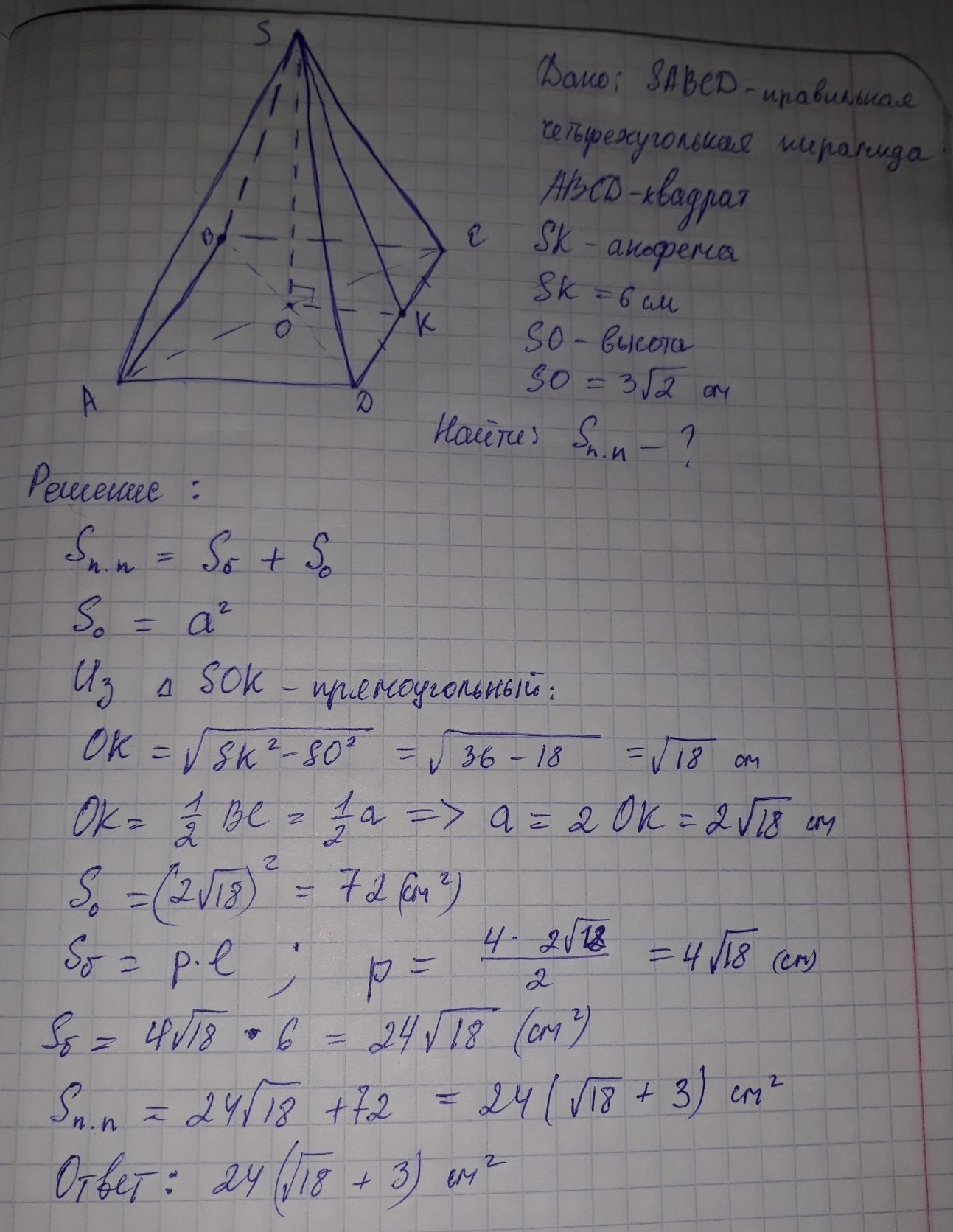 Апофема правильной четырехугольной пирамиды равна 6 см,а высота 3√2. Найти площадь поверхности пирамиды !!!!!!!!!!!!!!!!!!!!!!!!!!!!!!!!!!!!!!!!!!!!!!!!!!!!!!!!!!!!!!!!!!!!!!!!!!!!!!!!!!!!!!!!