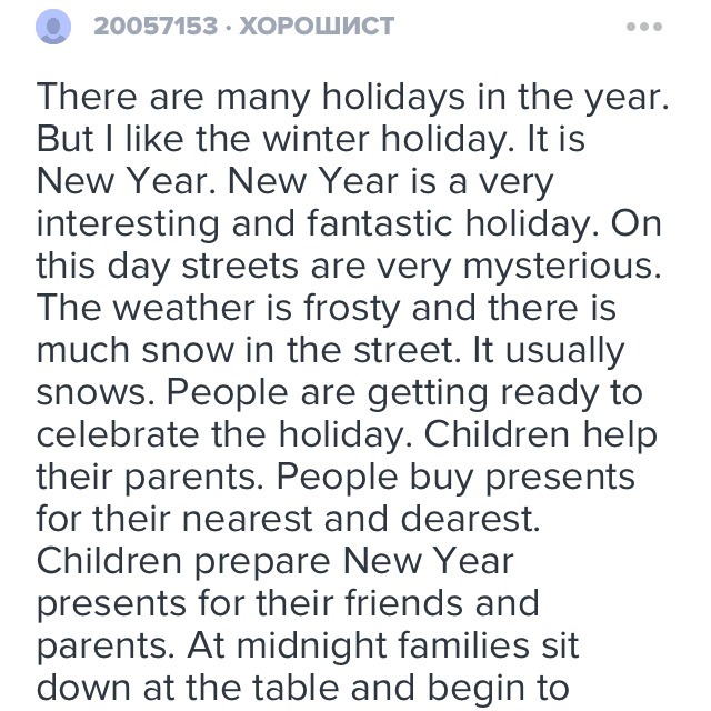 В году существует много праздников. Но я люблю зимний праздник. Это Новый год. Новый год очень интересный и фантастический праздник. В этот день улицы очень таинственные. Погода морозная и на улице много снега. Обычно идет снег. Люди готовятся праздновать праздник. Дети помогают родителям. Люди покупают подарки родственникам. дети готовят новогодние подарки друзьям и родителям. В полночь семьи садятся за стол и начинают....