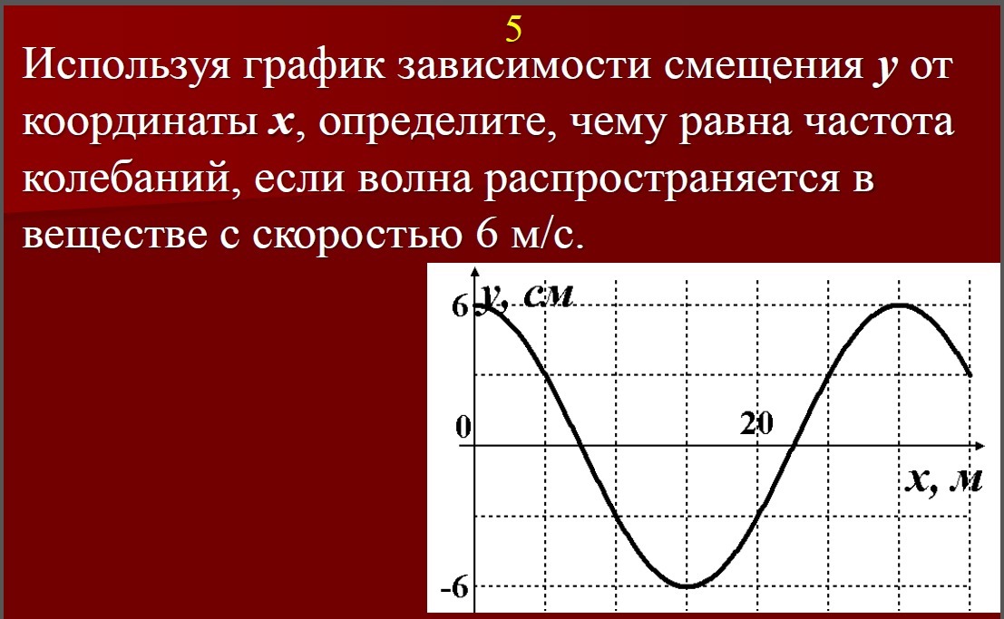 Используя график зависимости смещения уот координаты х, определите, чему равна частота колебаний, если волна распространяется в веществе с скоростью 6 м/с.