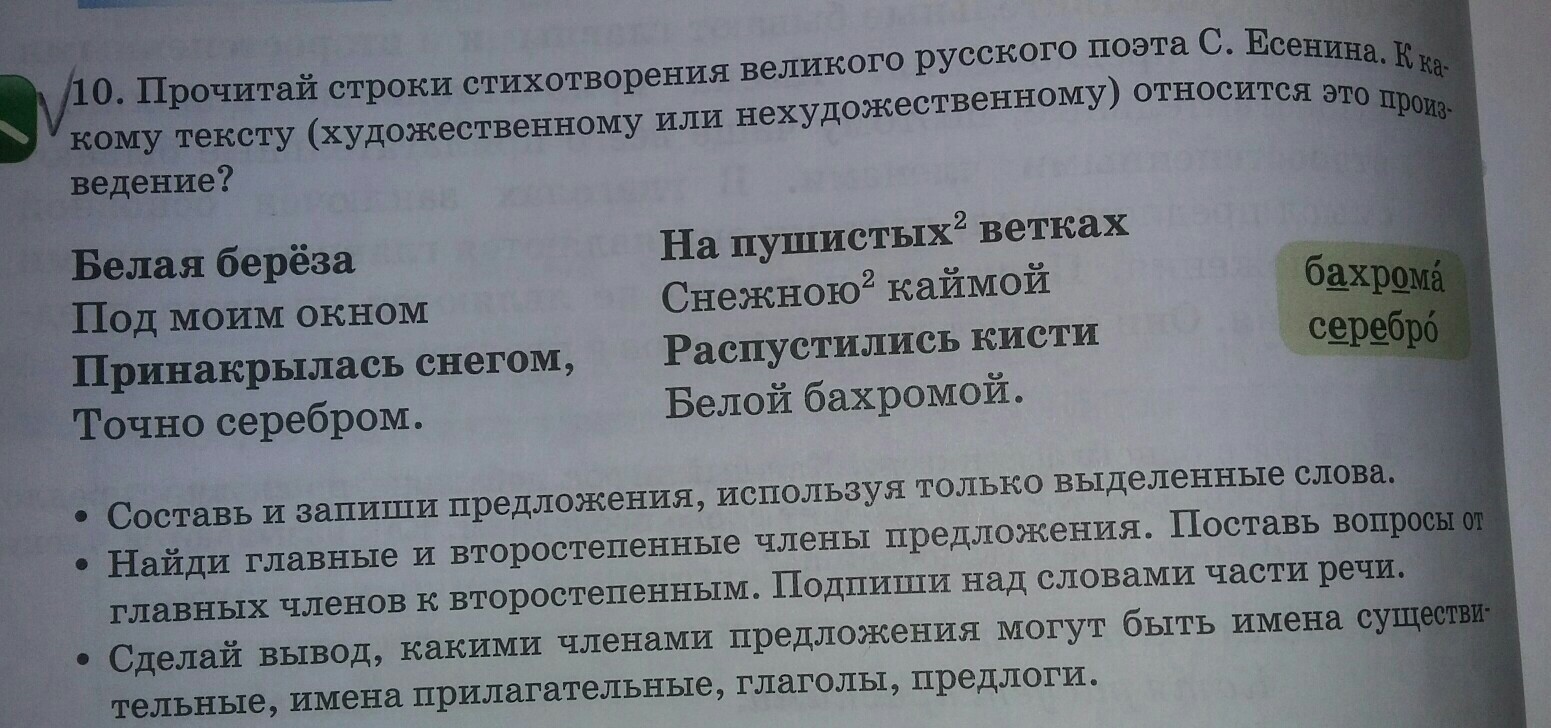 Прочитай строки из стихотворения великого русского поэта Есенина К какому тексту художественного или нехудожественная относится это произведение Белая берёза под моим окном принакрылась снегом точно серебром На пушистых ветках снежною косой распустились кисти белой бахромой Составь и запиши предложения используя только выделенные слова