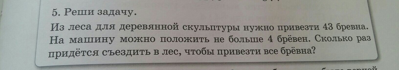 так как на машину можно положить не больше 4 то 43:4=10 целых маш и в одной маш оставш 3 бревна всего получ 11 раз съездить за бревнами в лес