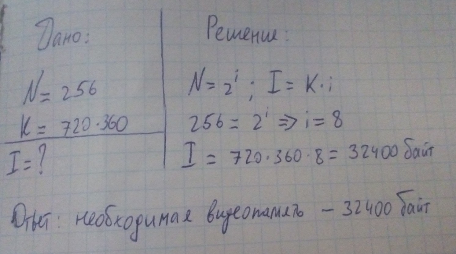 vРассчитай объём видеопамяти, необходимой для хранения графического изображения, занимающего весь экран монитора с разрешением 720×360 и палитрой из 2 цветов