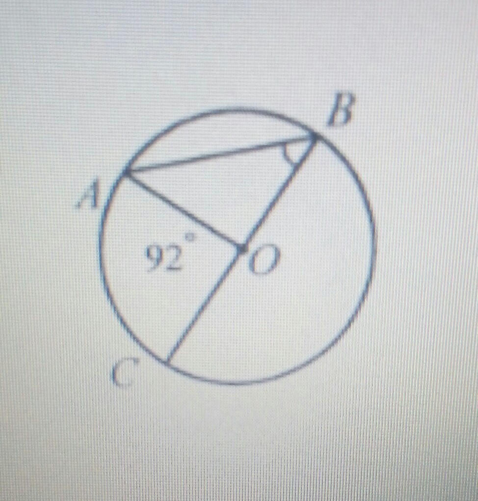 Найдите градусную меру угла ABC, если известно, что точка О является центром окружности, а градусная мера угла AOC равна 92°.