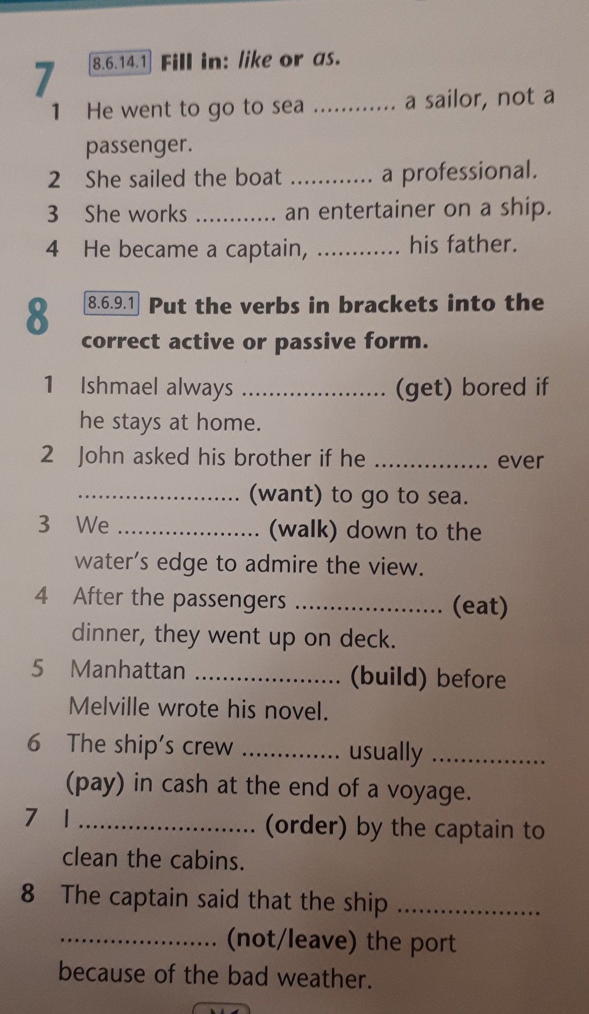 1.gets 2.has...wanted 3.walked 4.ate 5was built 6.are...paid 7.was ordered 8.wouldt leave.