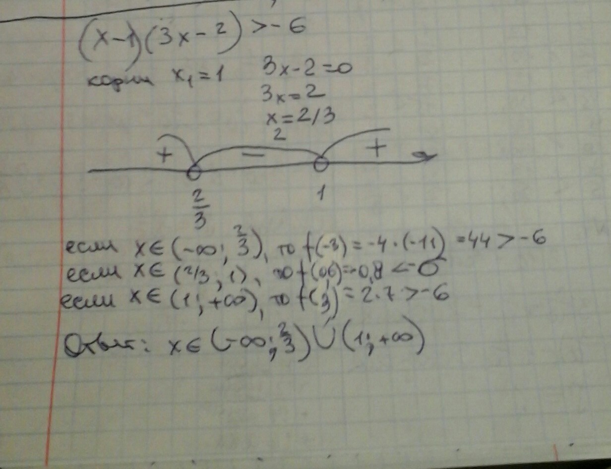 Решите пожалуйста неравенство методом интервалов.Пожалуйста если можно с рисунком.(x-1)•(3x-2)>-6