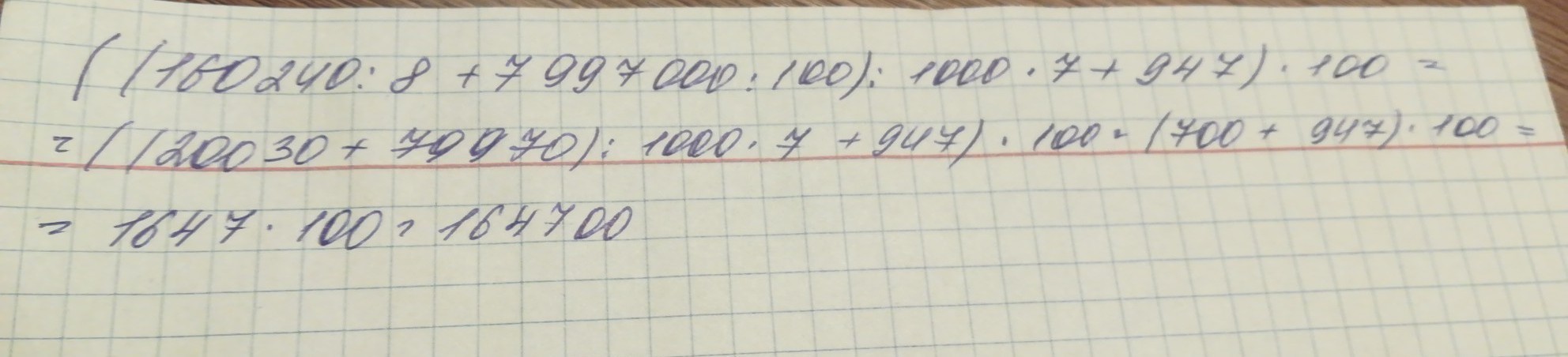 ((160240:8+7997000:100):1000•7+947)•100=164700