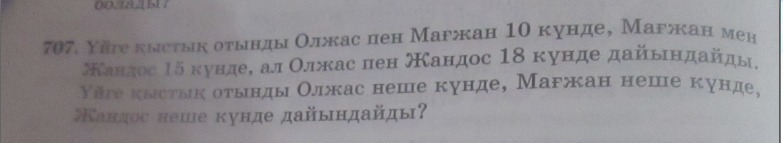 помогите срочно пожалуйста !!!!!!!!!!!!! перевод/ Зимние дрова в дом готовят Олжас и Магжан за 10 дней, Магжан и Жандос за 13 дней, Олжас и Жандос за 18 дней. На сколько дней Олжас готовит зимнюю дрову домой, сколько дней Магжан, Жандос?