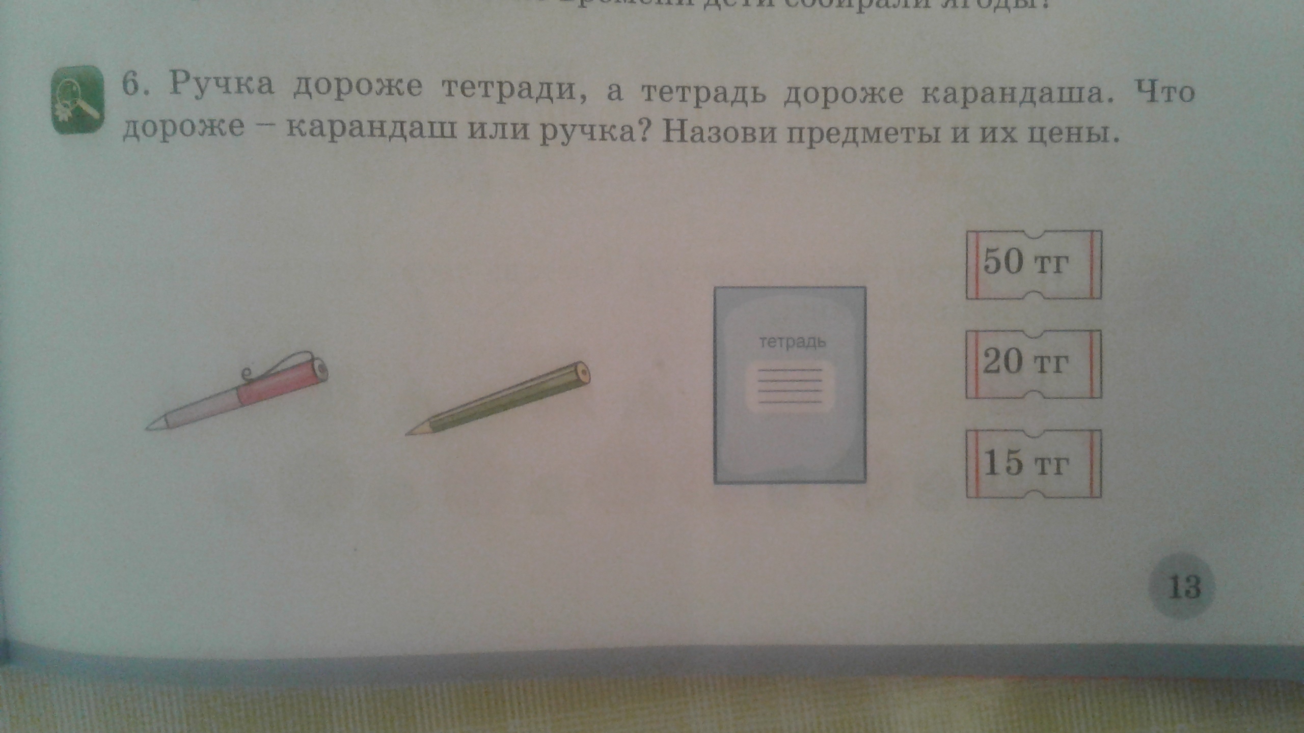 Ручка дороже тетради а тетрадь дороже карандаша.что дороже карандаш или ручка? Назови предметы и их цены.