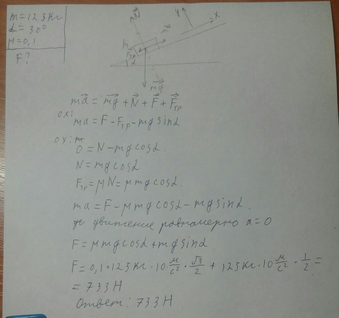 Сила которую надо приложить для равномерного подъёма вагонетки массой 125кг по эстакаде с углом 30 градусов если коэффициент сопротивление движению равен 0,1