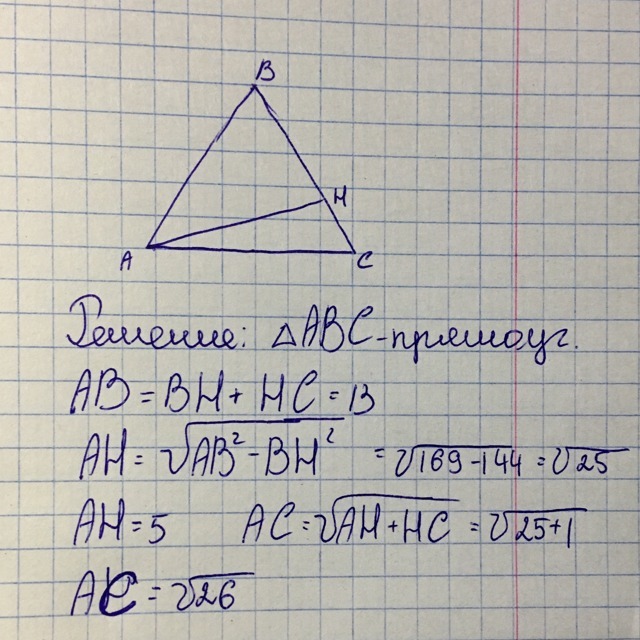 Высота равнобедренного треугольника делит его боковую сторону на отрезки длиной 1см и 12 см, считая от угла при основе.найдите основу данного треугольника.