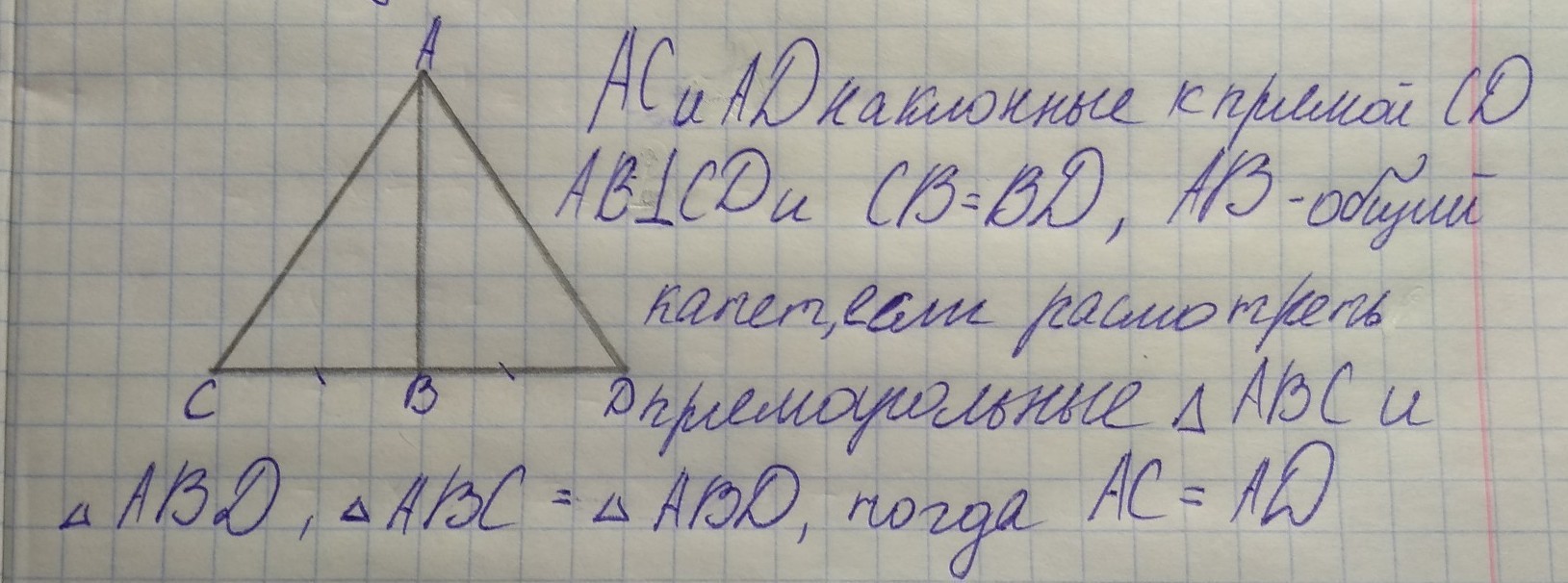 Докажите что если две наклонные проведенные из данной точки к данной прямой имеют равные проекции то они равны