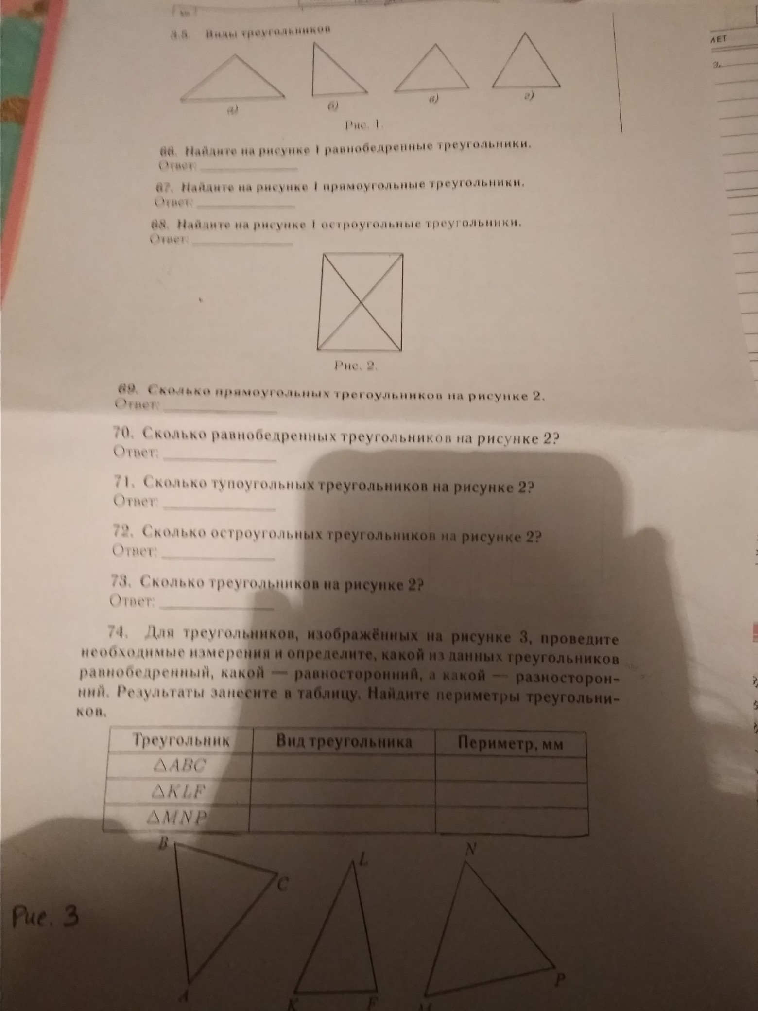74)треугольник АВС-равнобедренный,треугольник KLF-разносторонний,треугольник MNP-равносторонний.периметр-это сумма длин все сторон(посчитаешь сама,мне неудобно измерять))))