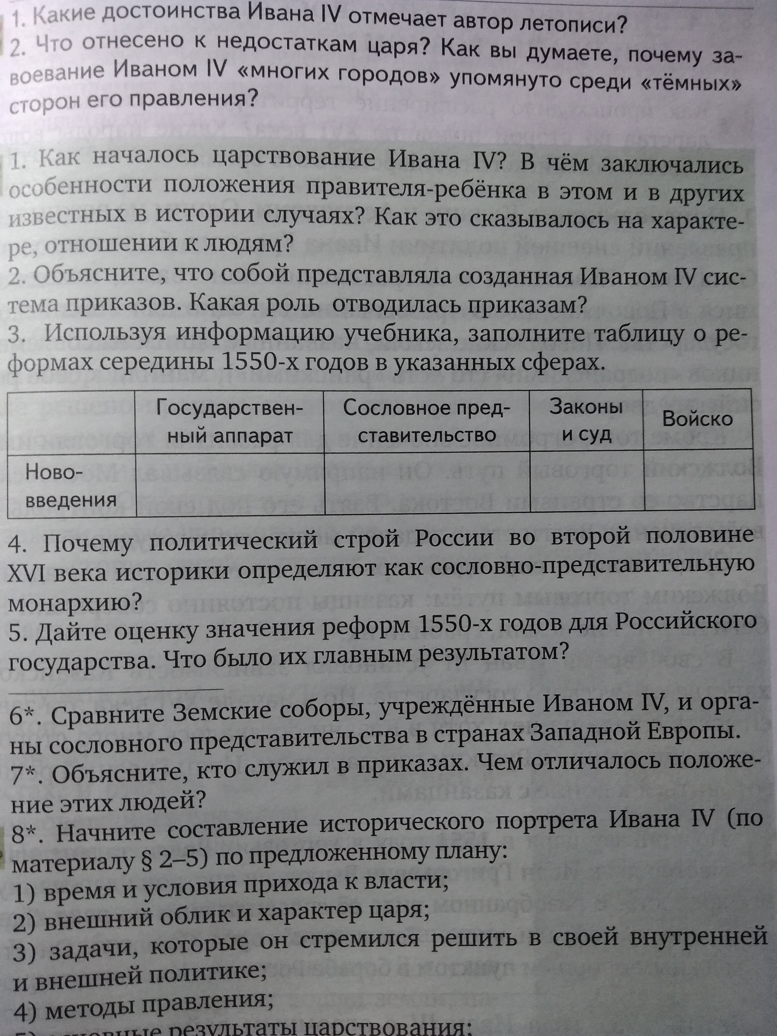 Используя информацию учебника, заполните таблицу о реформах середины 1550-х годов в указанных сферах.