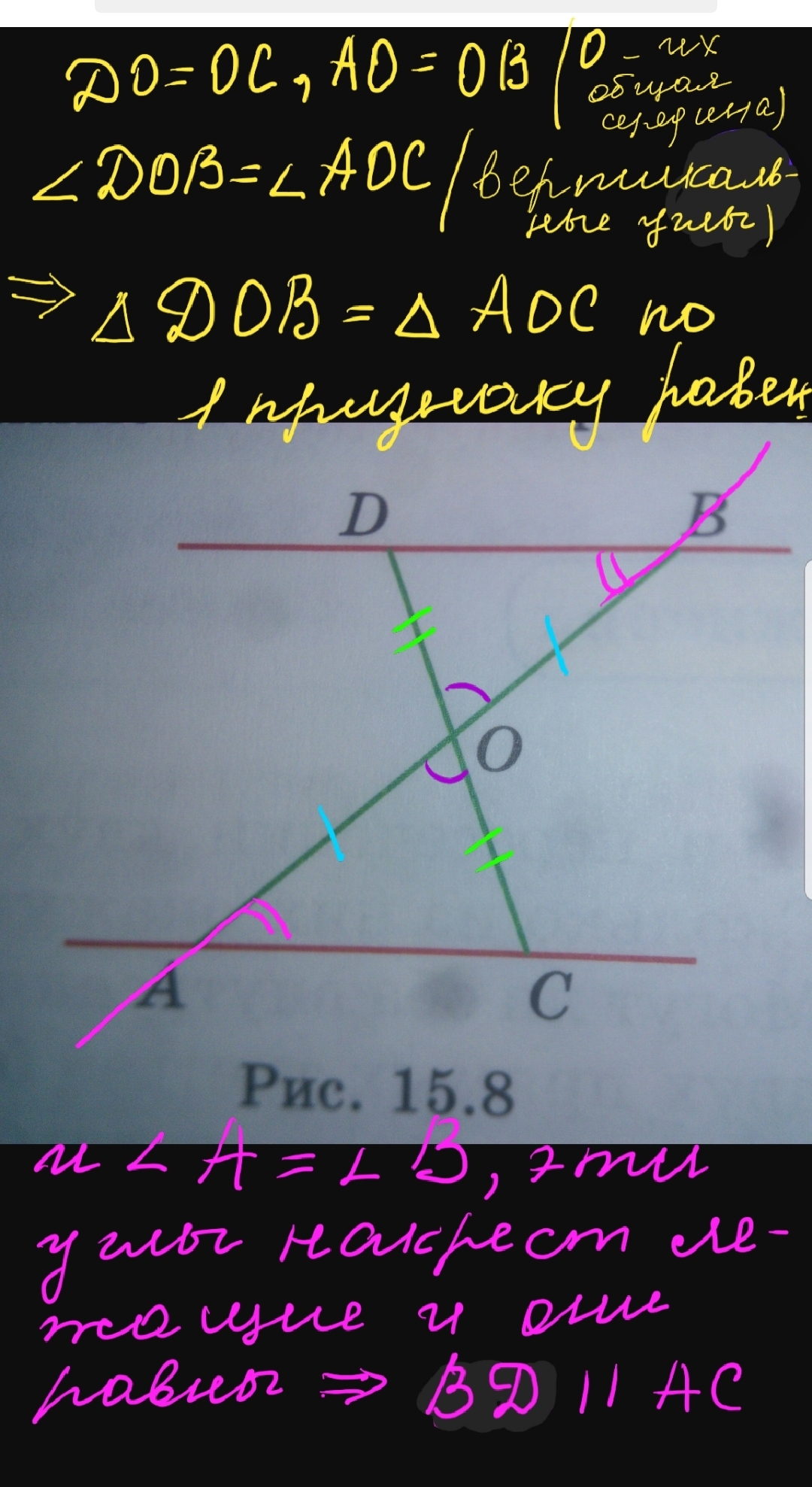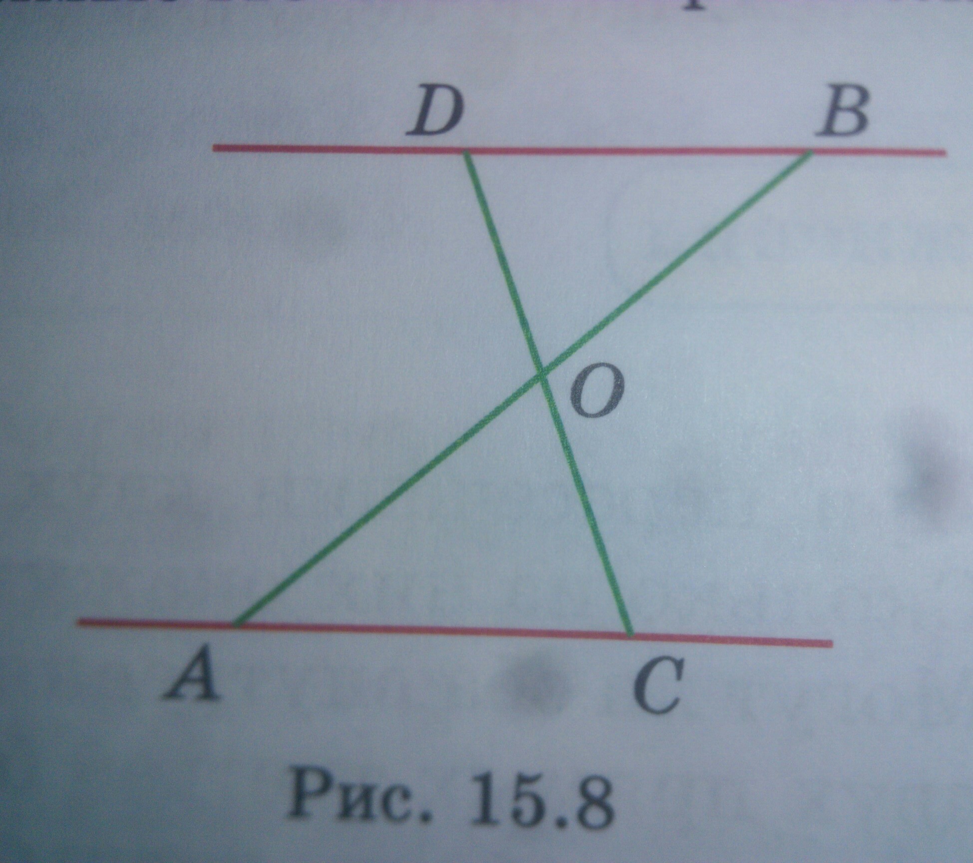 Отрезки AB и CD пересекаются в их общей середине O (рис. 15.8) Докажите, что прямые AC и BD параллельны.