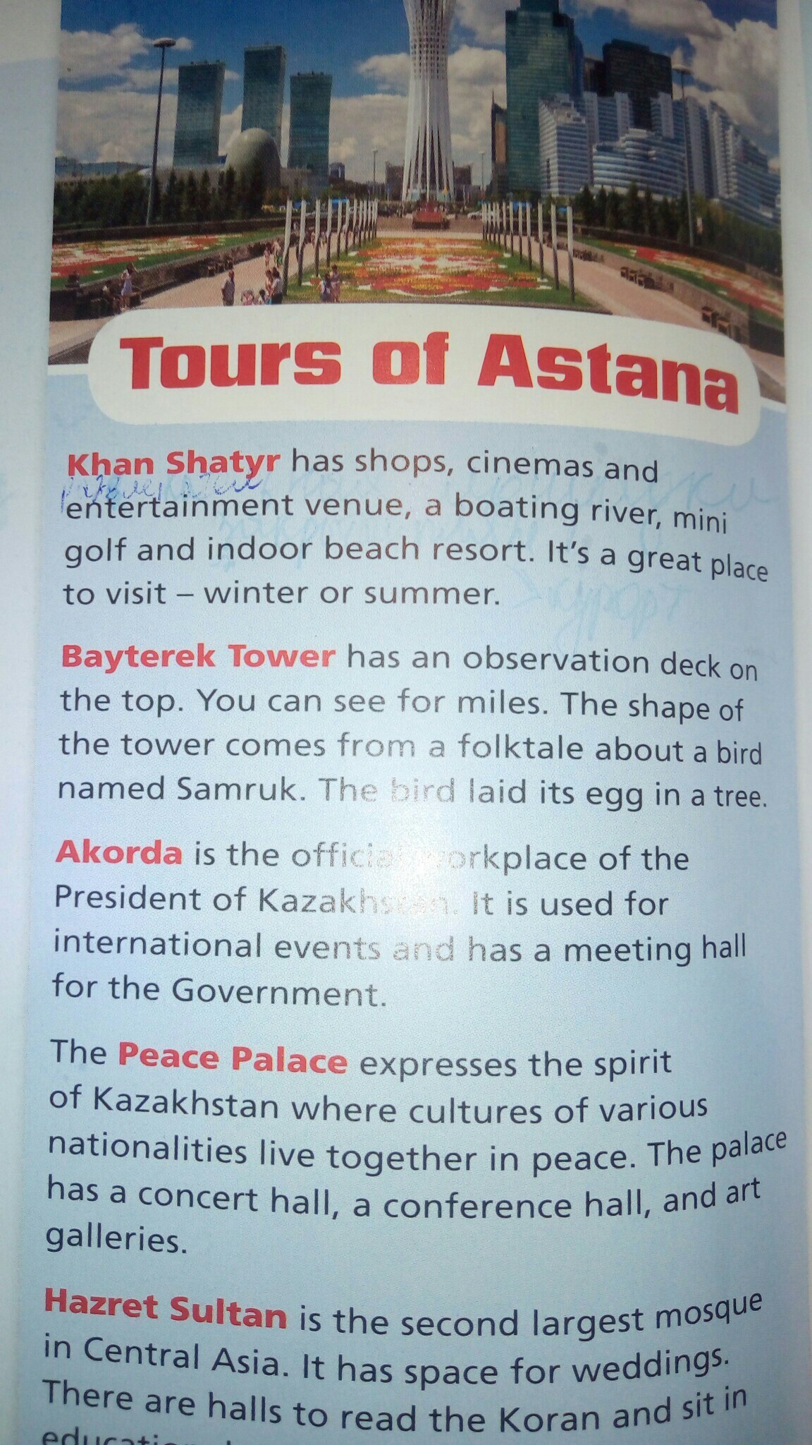 Хан Шатыр имеет магазины, кинотеатры и развлекательные заведения, лодочную реку, мини-гольф и крытый пляжный курорт. Это отличное место для посещения - или летом. Башня Байтерек имеет смотровую площадку сверху. Вы можете видеть за мили. Форма башни происходит от сказки о птице по имени Самрук. Птица снесла свое яйцо. Акорда является официальным местом Президента Казахстана. Она используется для международных мероприятий и имеет зал заседаний для правительства.