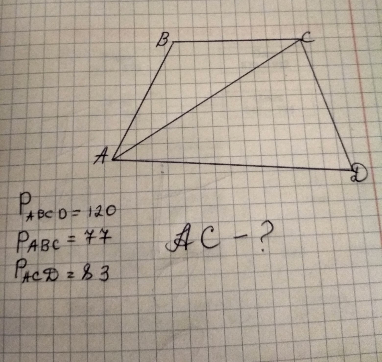 Pabcd=Pabc+Pacd-2AC ⇒ AC=((Pabc+Pacd)-Pabcd)/2=((77+83)-120)/2=20 ед.