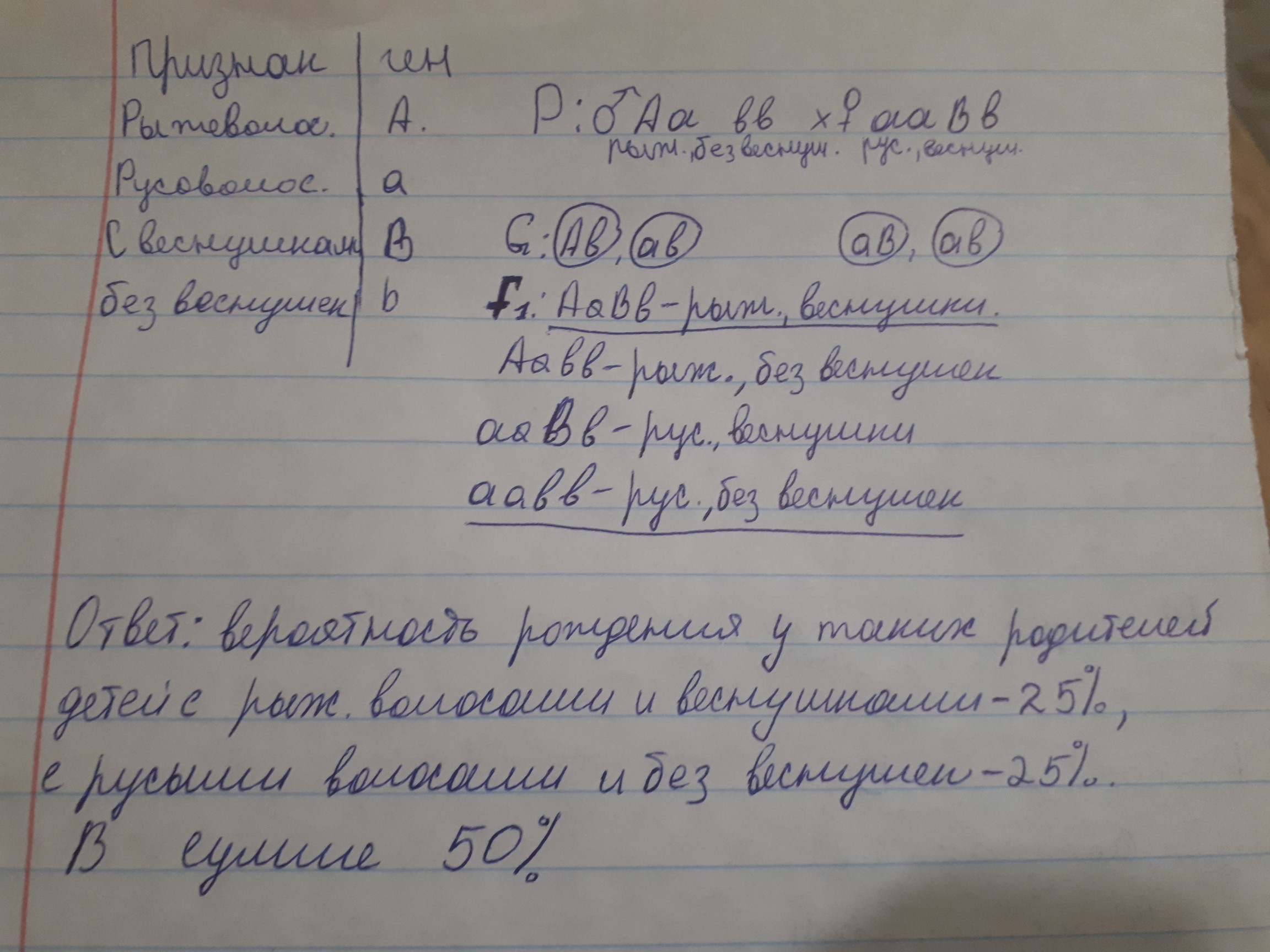 Рыжеволосый (доминантный признак) и без веснушек мужчина и русоволосая женщина с веснушками (доминантный признак) имеют русоволосого без веснушек сына. Определите вероятность рождения у таких родителей детей с рыжими волосами и веснушками и не рыжих без веснушек.