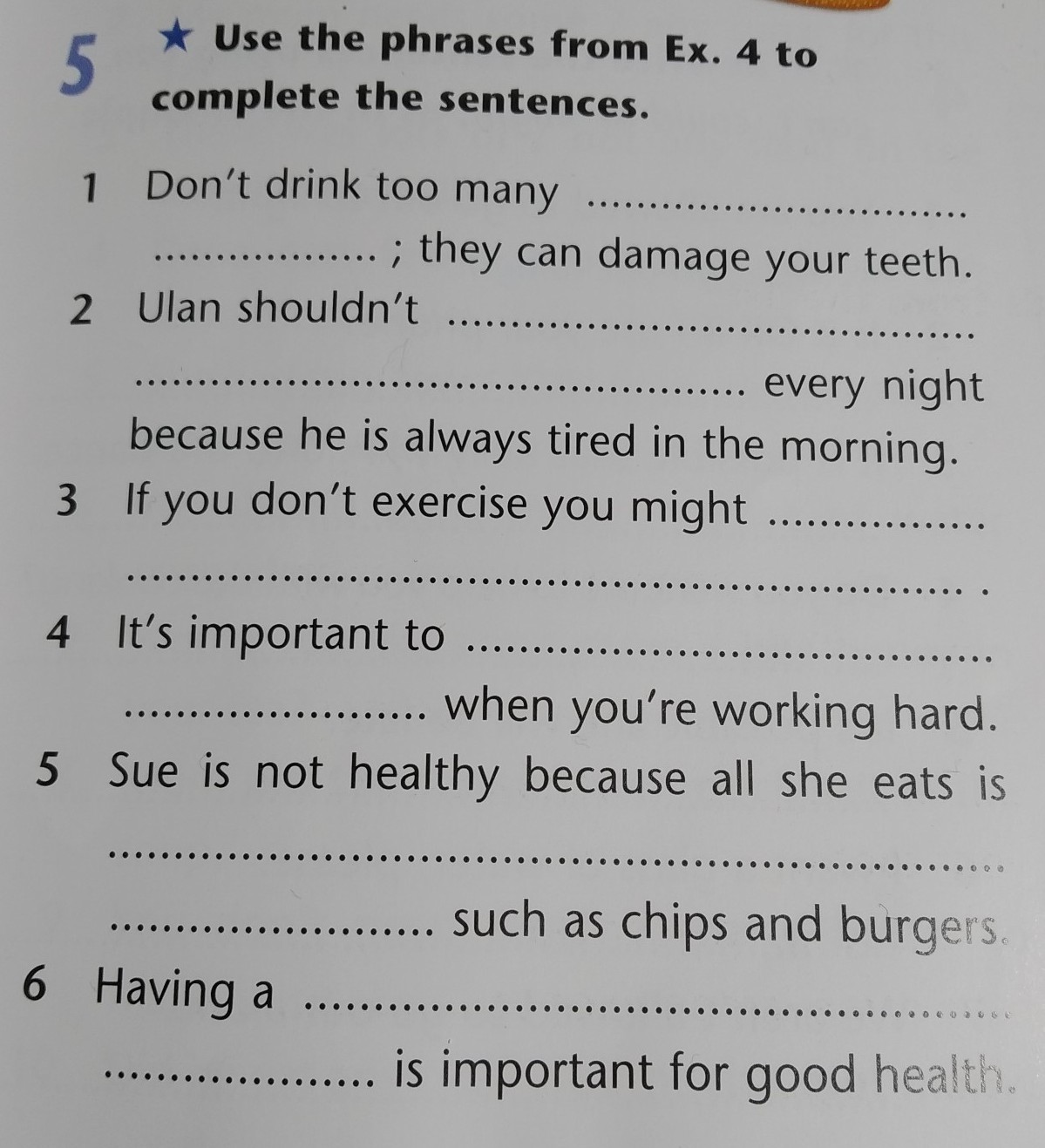 5) Sue is not healthy because all she eats is junk food such as chips and burgers.