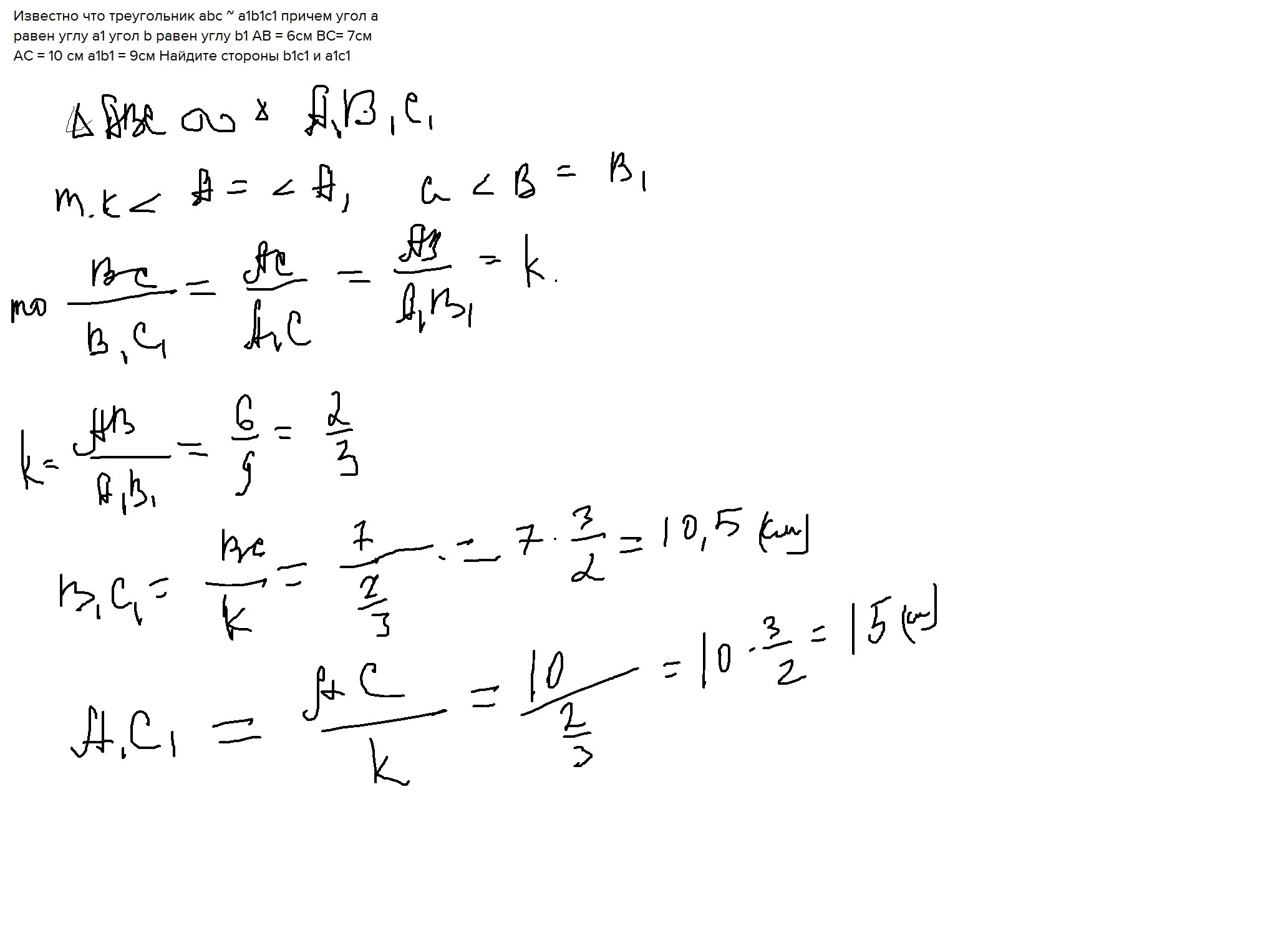 известно что треугольник abc ~ a1b1c1 причем угол а равен углу а1 угол b равен углу b1 AB = 6см BC= 7см AC = 10 см a1b1 = 9см Найдите стороны b1c1 и a1c1