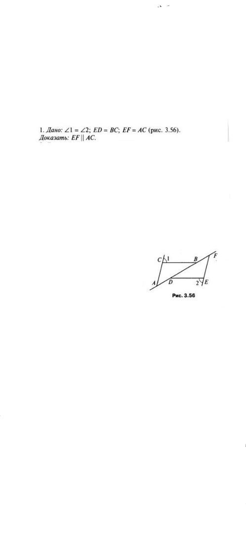 <ACB=<DEFт.к. они смежные <1 и <2. Треугольники ACB и DEF равны по двум сторонам и углу между ними,CB=DE.AC=FE. значит <CAB=<DFE и они накрест лежащие при прямых АС и FE и секущей AF. значит ACIIFE