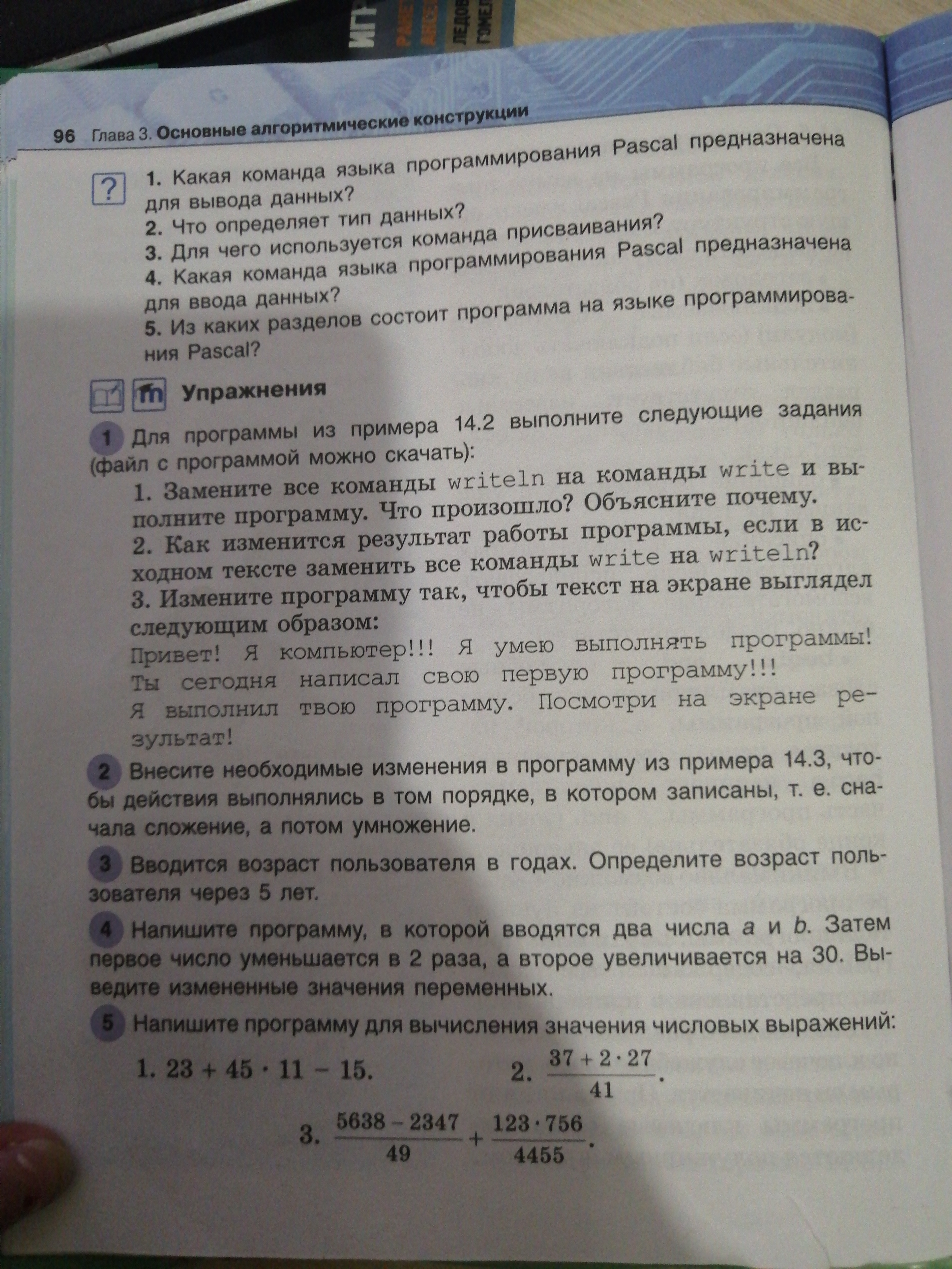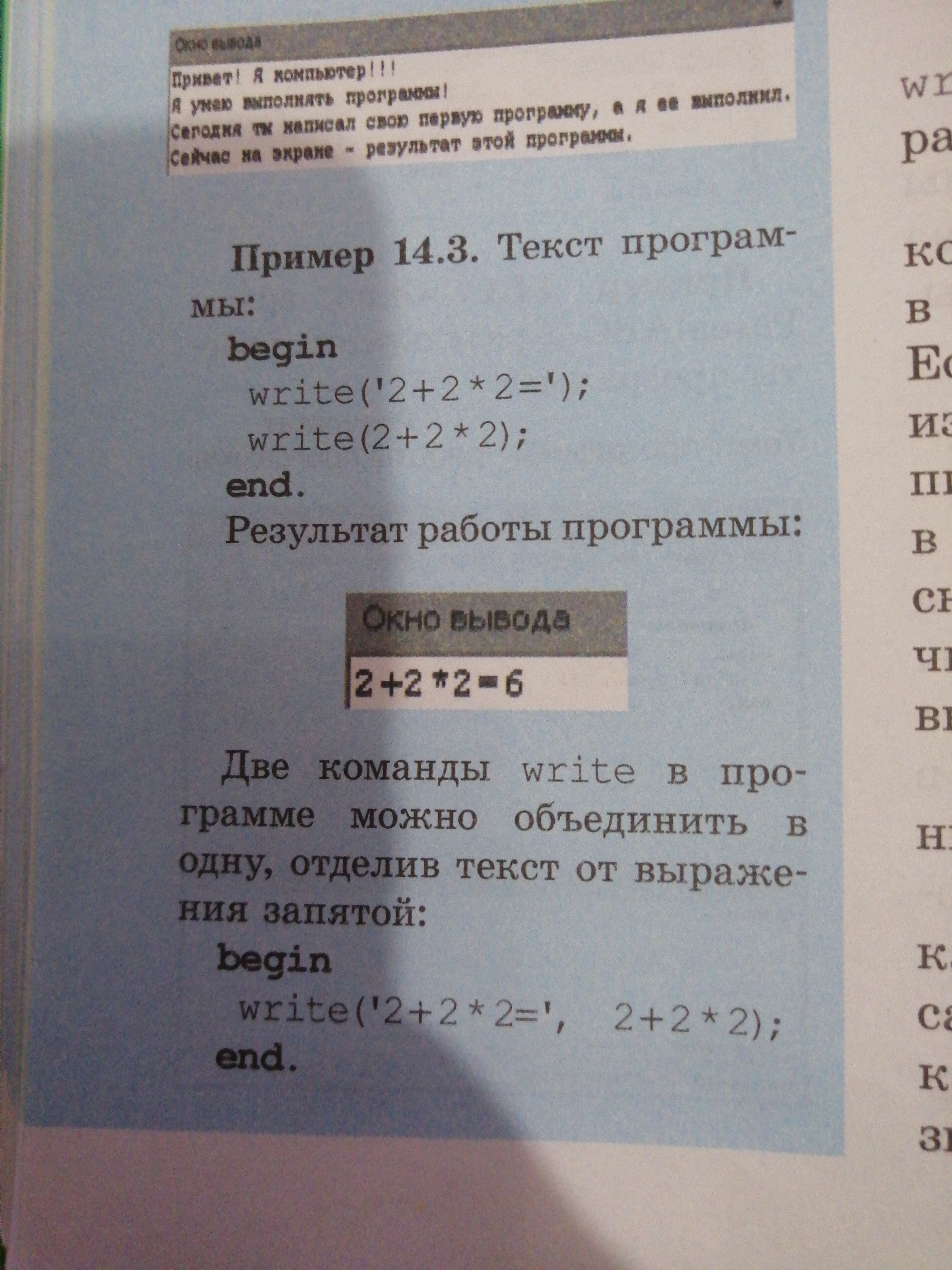 3. Write("Привет! "); Write("Я компьютер!!! "); Write("Я умею выполнять программы!"); Writeln("Ты сегодня написал свою первую программу!"); Writeln("я ВЫПОЛНИЛ ТВОЮ ПРОГРАММУ. ПОСМОТРИ НА ЭКРАНЕ РЕ-"); Writeln("зультат!");