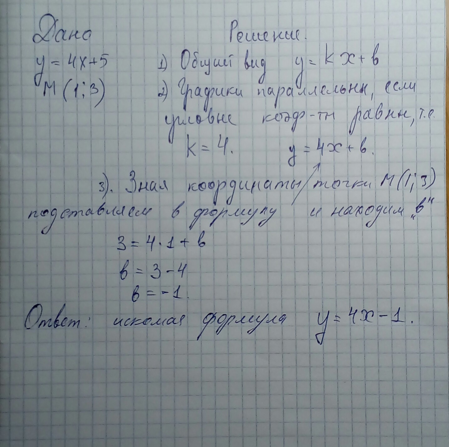 Задайте формулой линейную функцию, график которой параллелен графику функции y=4x+5 и проходит через точку M(1;3)