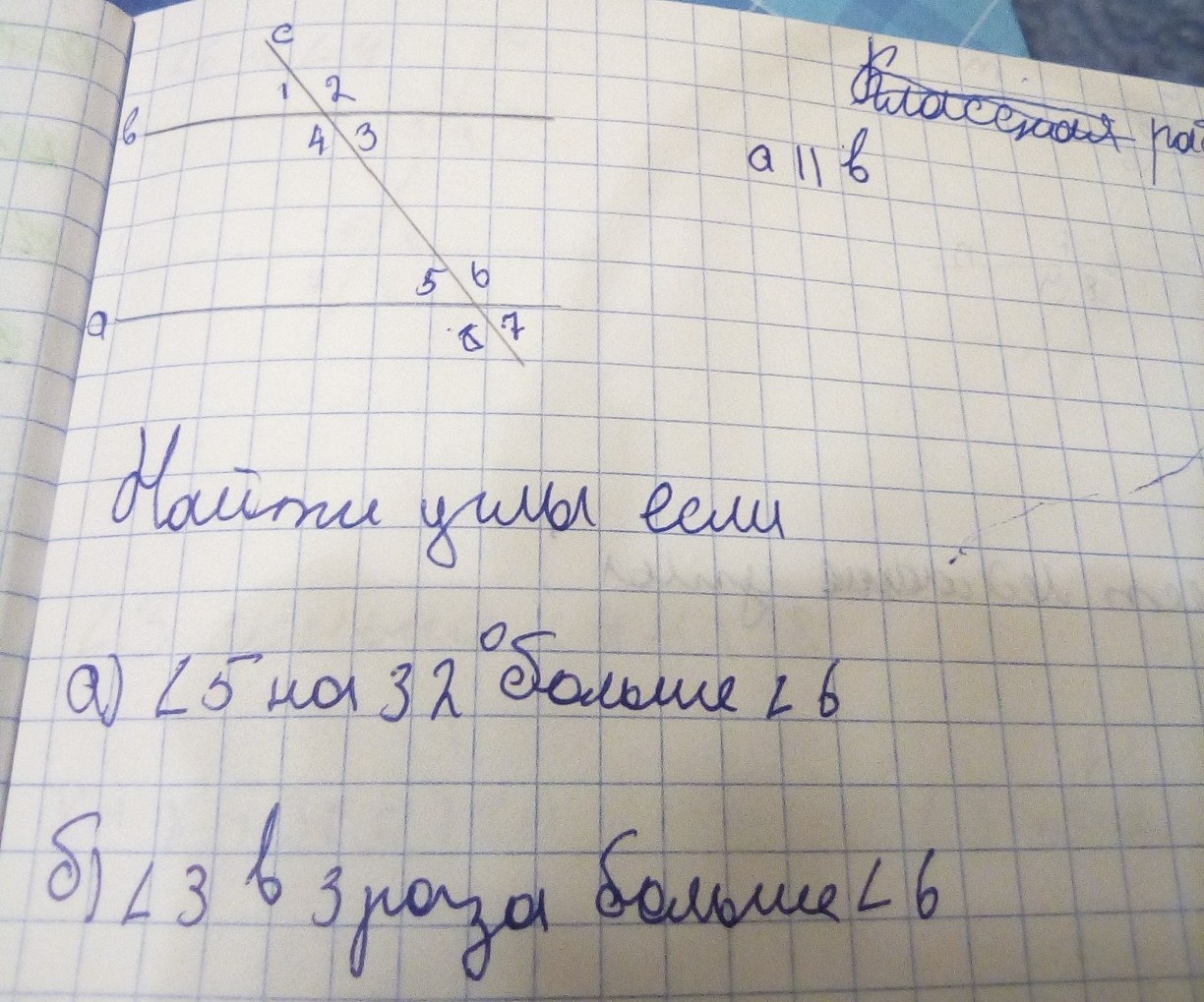 Ответ не сложен, согласно закону о паралельных прямых угол 3 + угол 6 = 180, представим 6 - это Х, тогда 3 - это 3 Х, изэтого выходит 180 = 4 Х, Х = 45, ОТВЕТ - угол 6 = 45, угол 3 = 135, надеюсь помог