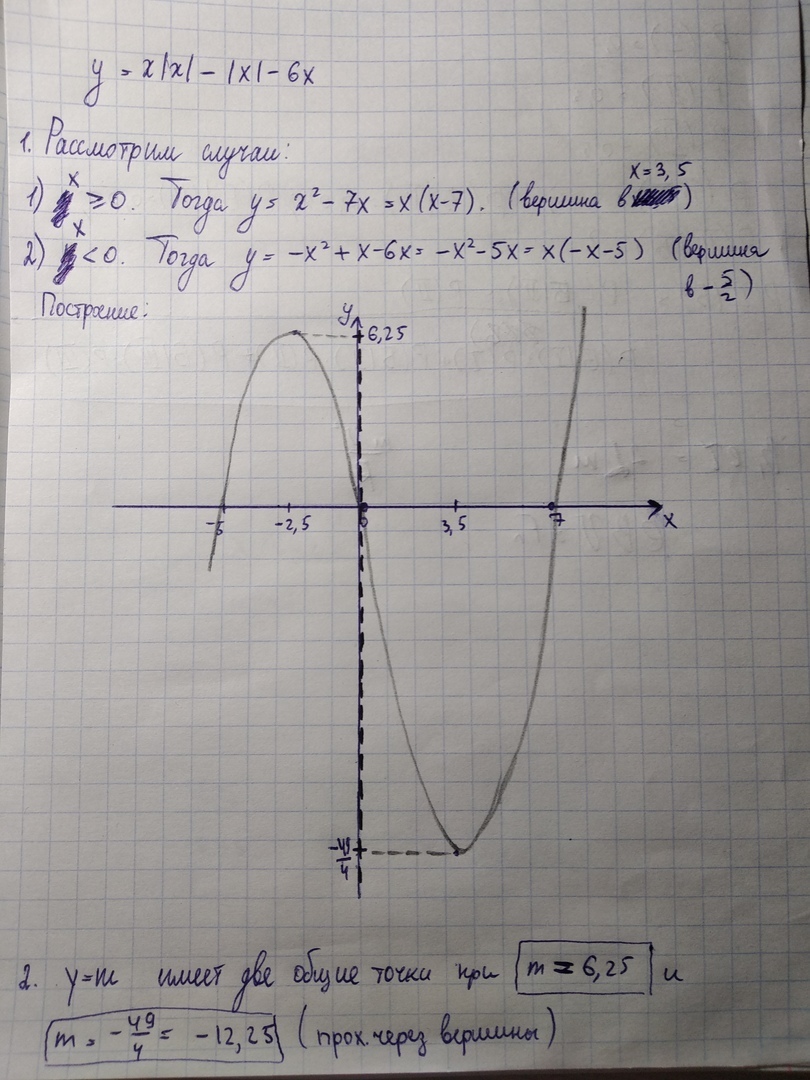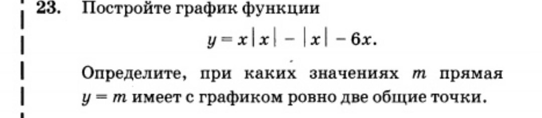 Постройте график функции у=х|х|-|х|-6х. Определите при каких значениях m прямая у=m имеет с графиком ровно 2 общие точки !! хелп