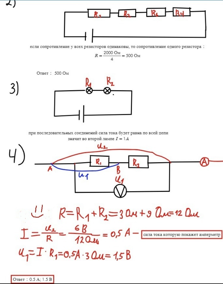 2. Участок цепи состоит из четырех последовательно соединенных одинаковых резисторов. Чему равно сопротивление одного резистора, если общее сопротивление участка цепи 2 кОм?