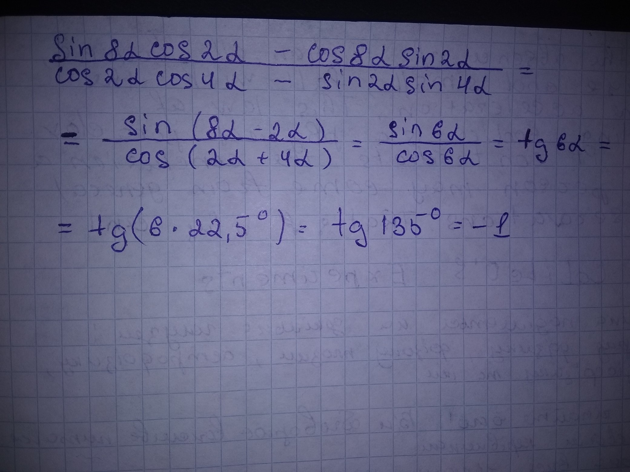 (sin8acos2a-cos8asin2a)/(cos2acos4a-sin2asin4a)=sin(8a-2a)/cos(2a+4a)=sin(6a)/cos(6a)=tg(6a)