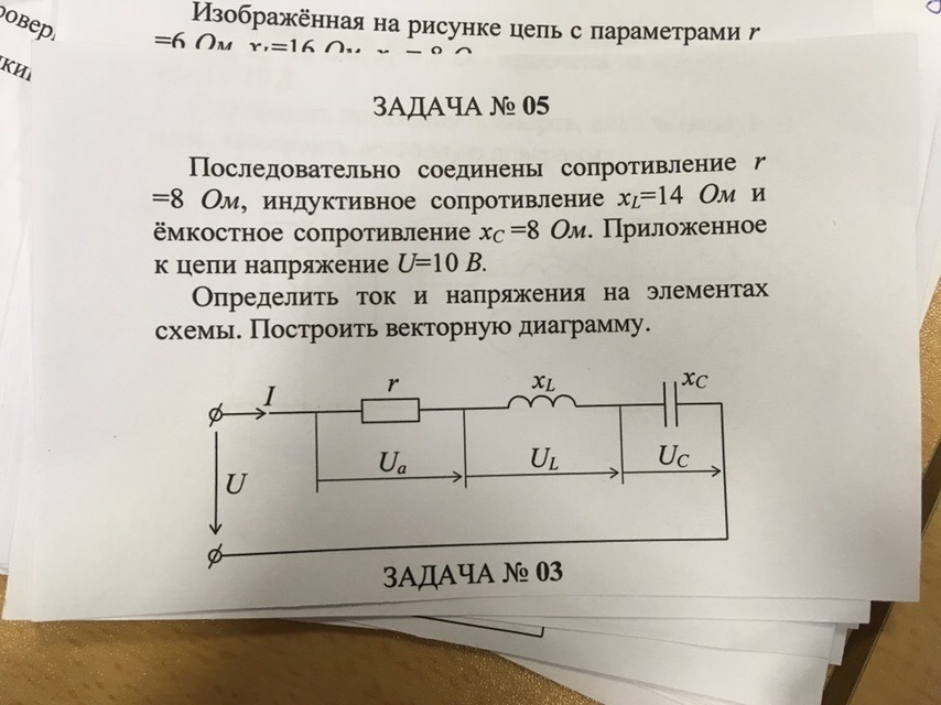 Полное сопротивление цепи Z=√[r²+(Xл-Xc)²]=√[8²+(6)²]= 10 Ом, ток I=U/Z=1A, Ua=1*8= 8 В, Uл=14 В, Uc=8 B, cosф=r/Z=0.8, ф=