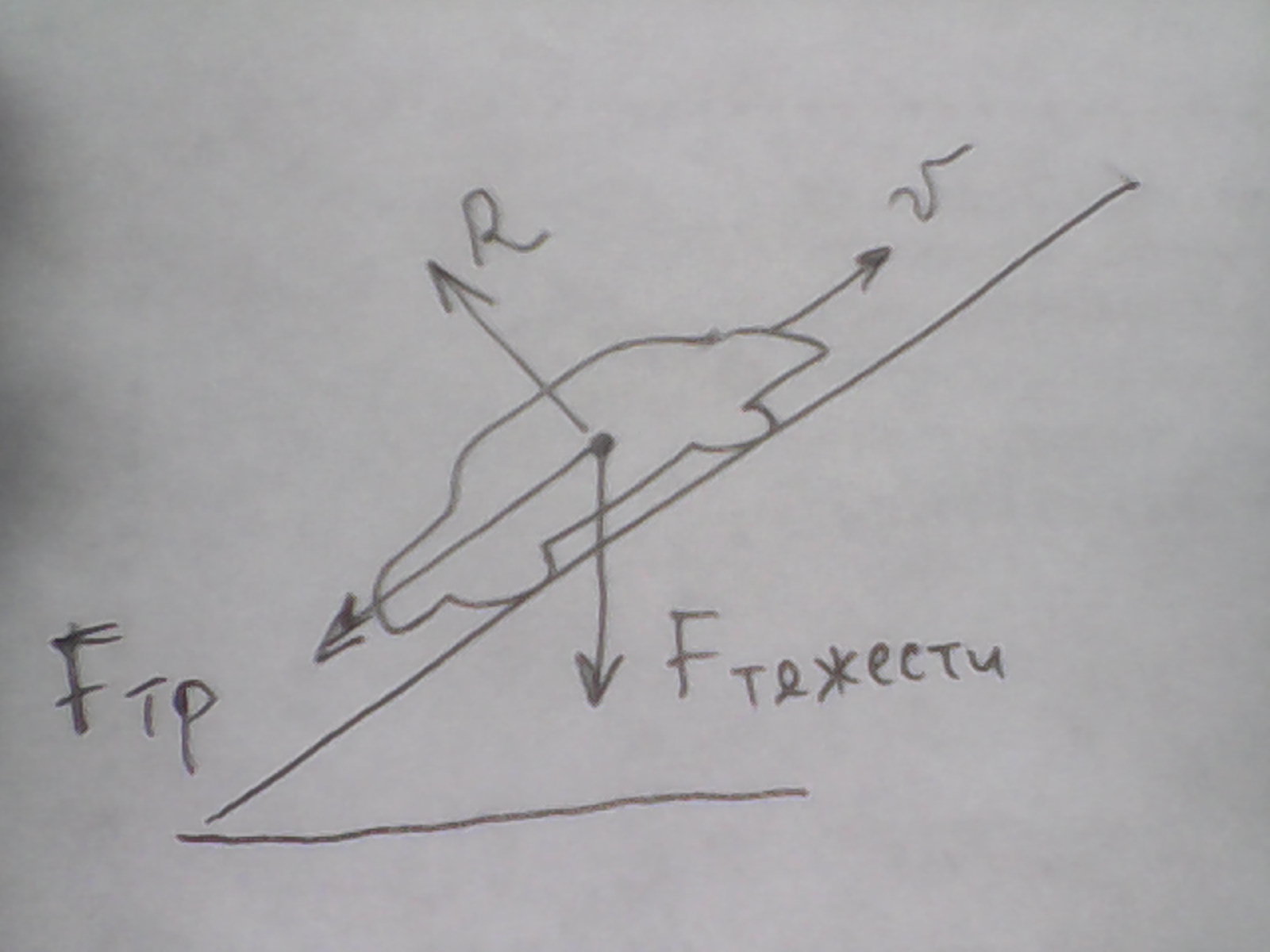 В гору заезжает автомобиль. Нарисовать силу тяжести, силу реакции опоры и силу трения , действующие на тело.
